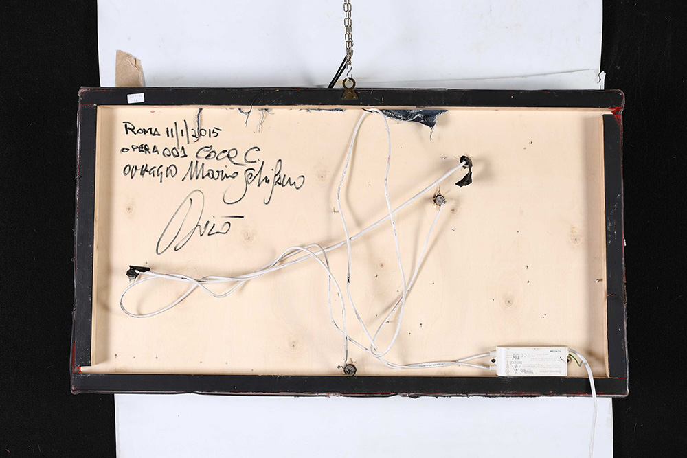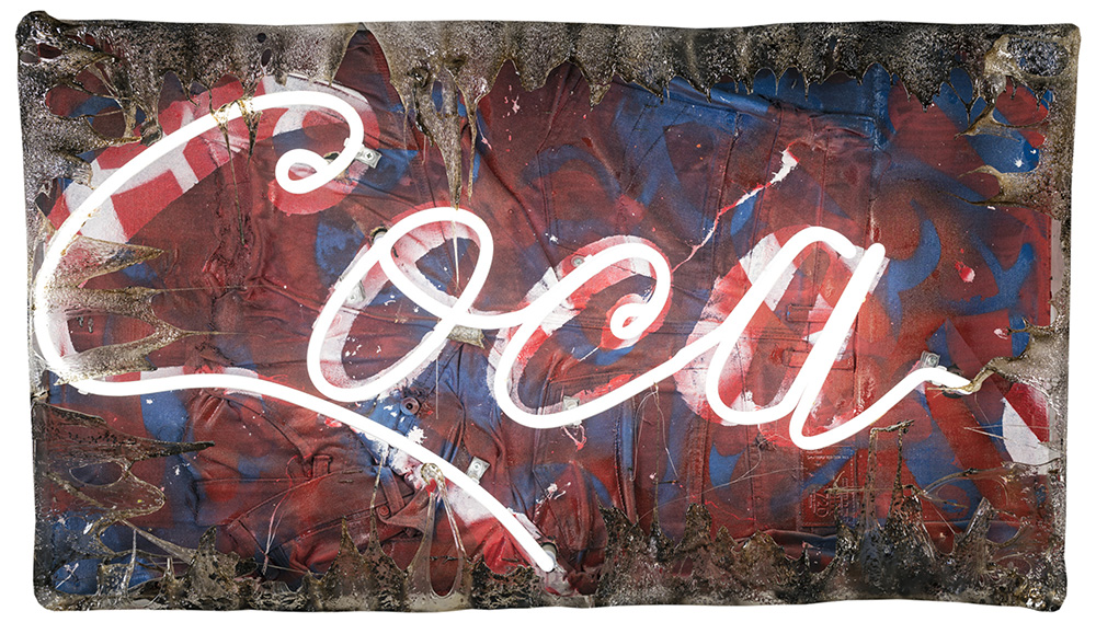 ENRICO DICÒ (Roma 1964) COCA C. OMAGGIO MARIO SCHIFANO scultura tecnica mista (plastica bruciata, neon e collage), cm 52x93. Al retro firma, data e titolo. Opera eseguita nel 2015