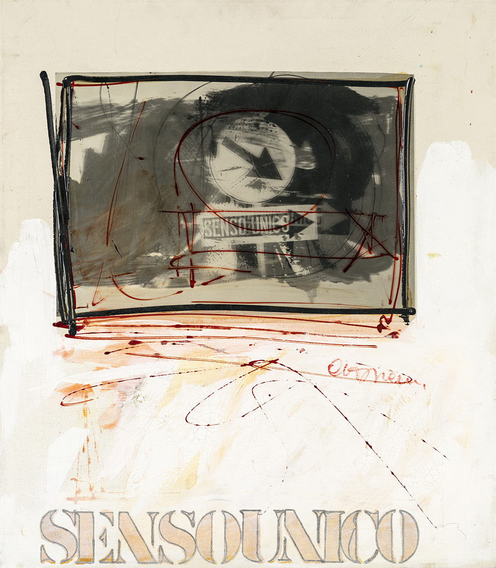 ANTONIO DEL DONNO (Benevento 1927) SENSO UNICO tecnica mista su tela, cm 80x70. Firma in basso a destra e sul retro