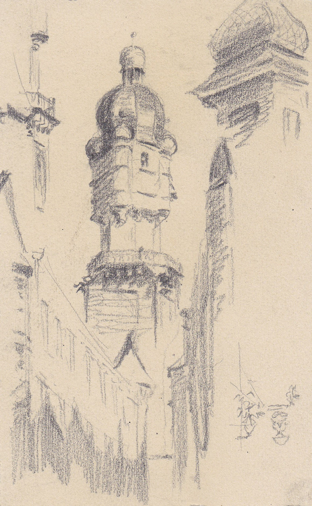 Hugo Grimm (Wien/Vienna 1849 – Innsbruck 1931) Torre civica di Innsbruck, 1899 ca.;Matita, 16 x 10 cm