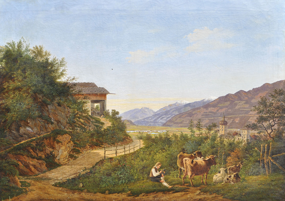 Maler um 1850/Pittore del 1850 ca. Castello Büchsenhausen con vista sulla valle dell‘Inn;Öl auf Leinwand, 69 x 96 cm, kleine alte Restaurierungen, beschädigter