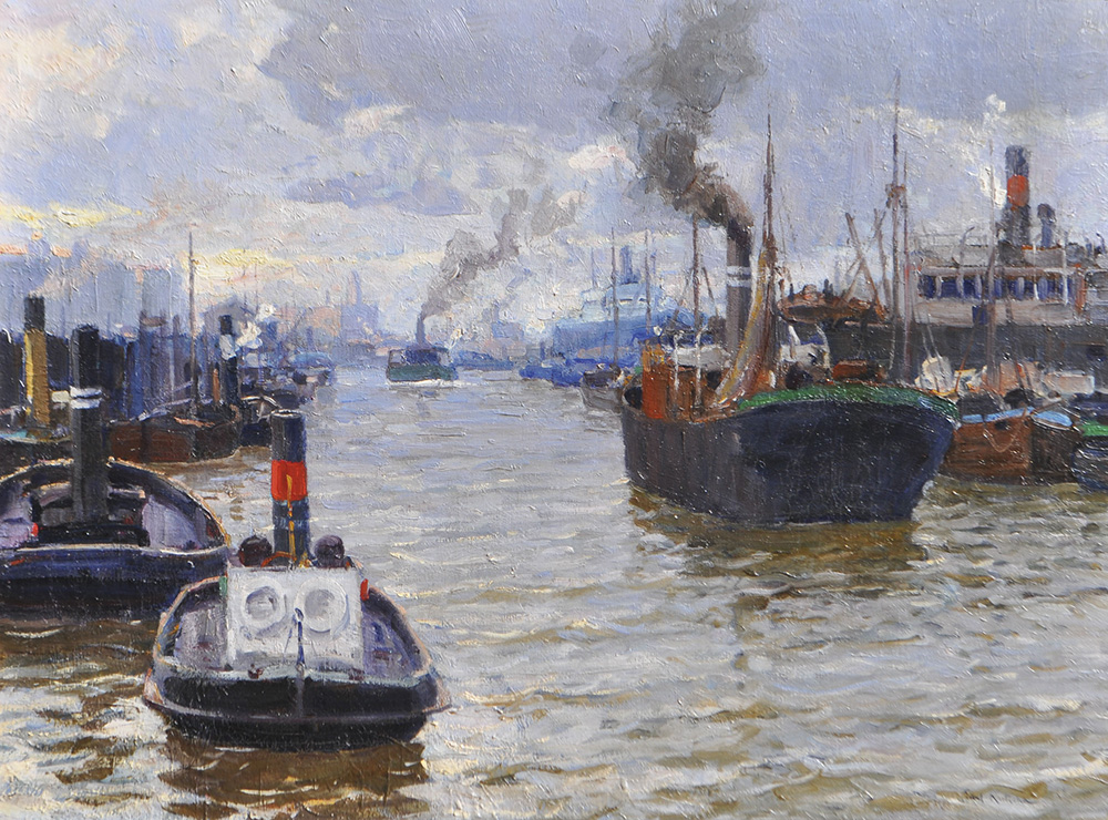 Paul Kutscha (Pruchna, Polen/Polonia 1872 – München/Monaco di Bavera 1935) Porto di Amburgo;Olio su tela, 58,5 x 78,5 cm, in cornice