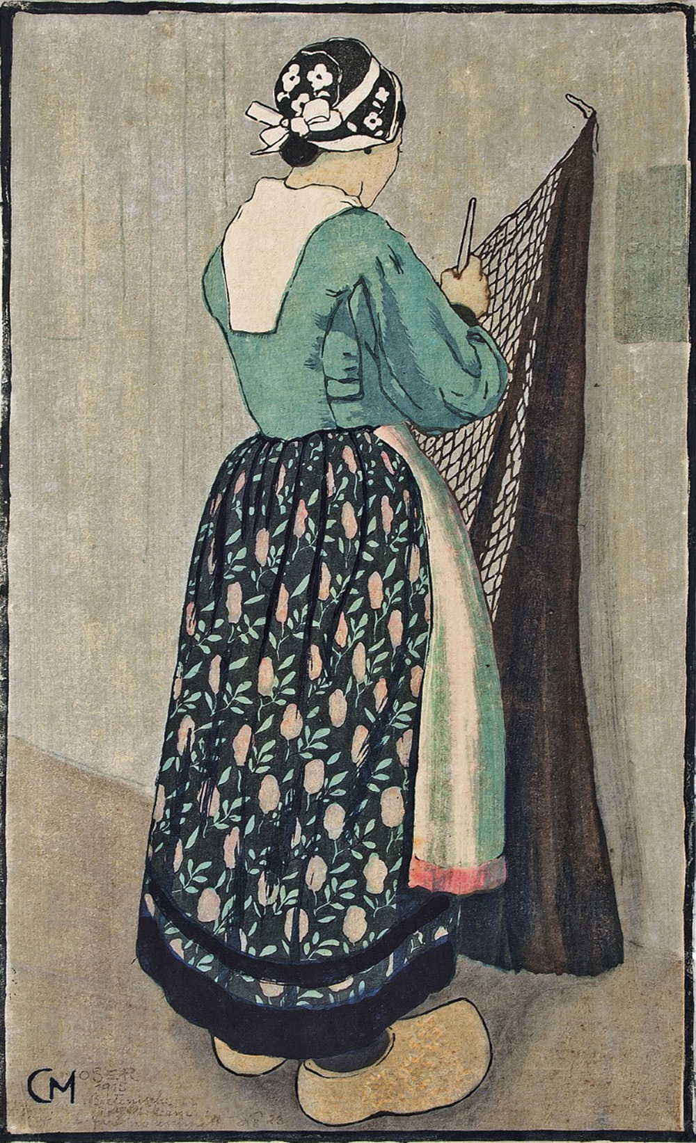 Carl Moser Donna bretone che ripara le reti da pesca, 1915;Xilografia a colori su carta giapponese, 50,5 x 31,5 cm