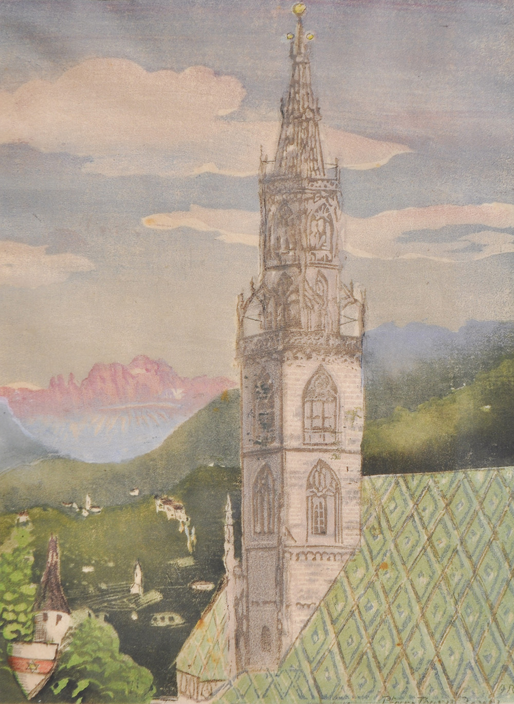 Anton Theodor Röggla Torre parrocchiale di Bolzano;Xilografia a colori, 33 x 24,5 cm, in