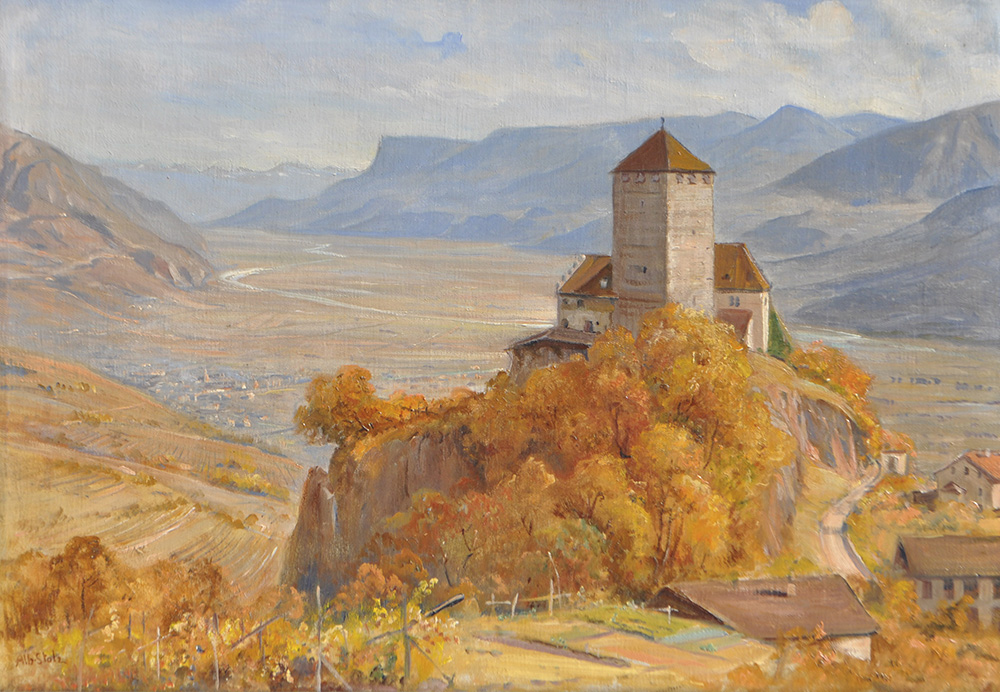 Albert Stolz (Bozen/Bolzano 1875 – 1947) Castel Tirolo con la Val d’Adige;Olio su tela, 53 x 76 cm, in cornice