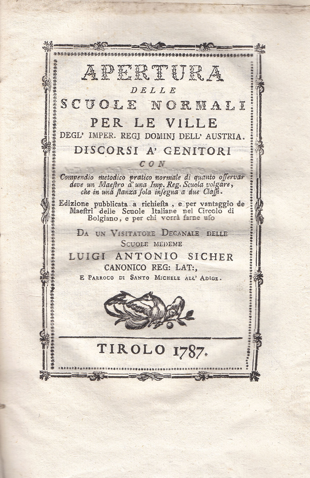 Luigi Antonio Sicher Apertura delle scuole...,1787;normali per le ville