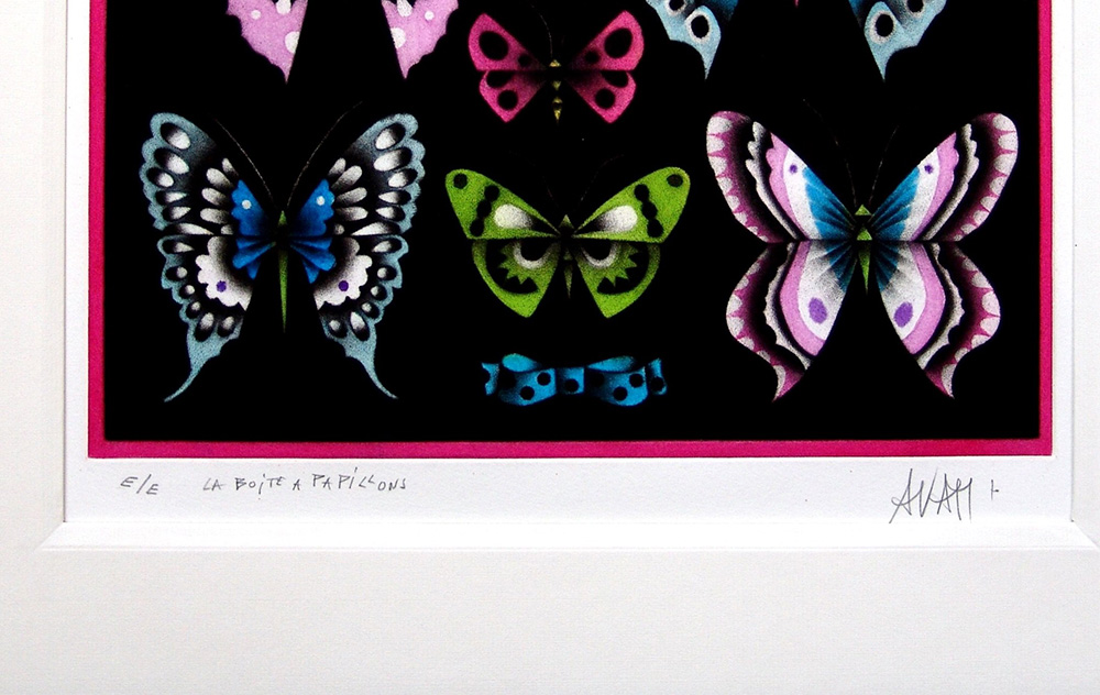 Mario Avati 1921, Principato di Monaco - 2009, Parigi - [Francia] La boite a papillons incisione mezzatinta 50x70 cm es. E/E; firma dell'artista in basso a destra; f.to lastra 22x28 cm certificato di autenticità Picenum