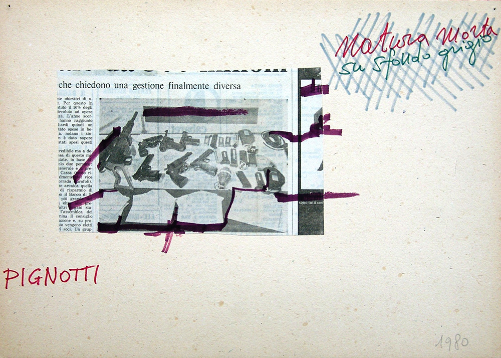 Lamberto Pignotti 1926, Firenze (Fi) - [Italia] Natura morta su sfondo grigio tecnica mista e collage su carta 25x35 cm 1980 firma dell’artista in basso a sinistra e sul retro certificato di autenticità dell’artista su fotografia