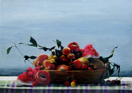Beniamino Ciccotelli 1937, Tollo (Ch) - [Italia] Cesto con pezzi di cocomero tecnica mista su tela 50x70 cm 2011 firma dell’artista in basso a destra e sul retro; opera con cornice certificato di autenticità firmato dall'artista