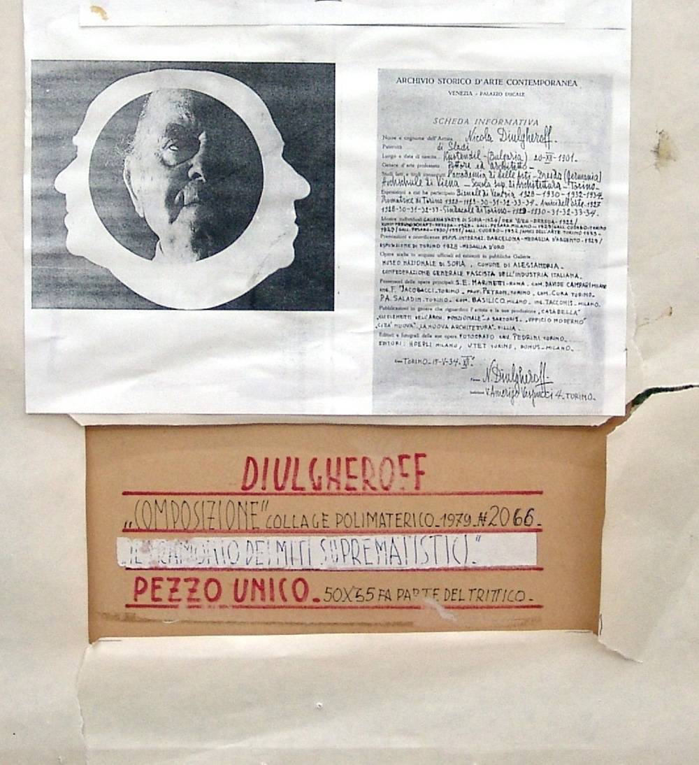 Nicolay Diulgheroff 1901, Kjustendil (Bulgaria) - 1982, Torino (To) - [Bulgaria] Composizione collage su cartoncino 50x35 cm 1979 firma dell'artista in basso a destra e sul retro; opera con cornice certificato di autenticità Picenum; cartiglio sul retro