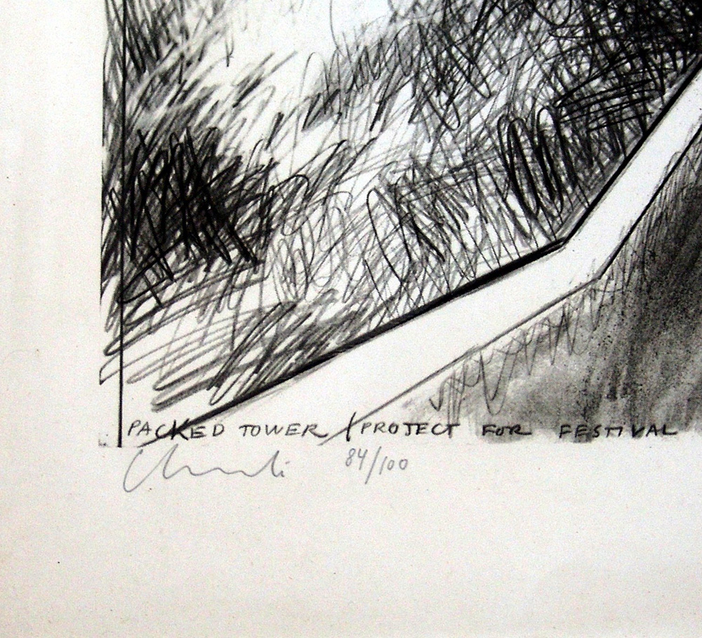Christo 1935, Gabrovo (Bulgaria) - [USA] Packed Tower - Spoleto litografia 83x64 cm 1972 es. 84/100; firma dell’artista in basso a sinistra; opera con cornice certificato di autenticità Picenum