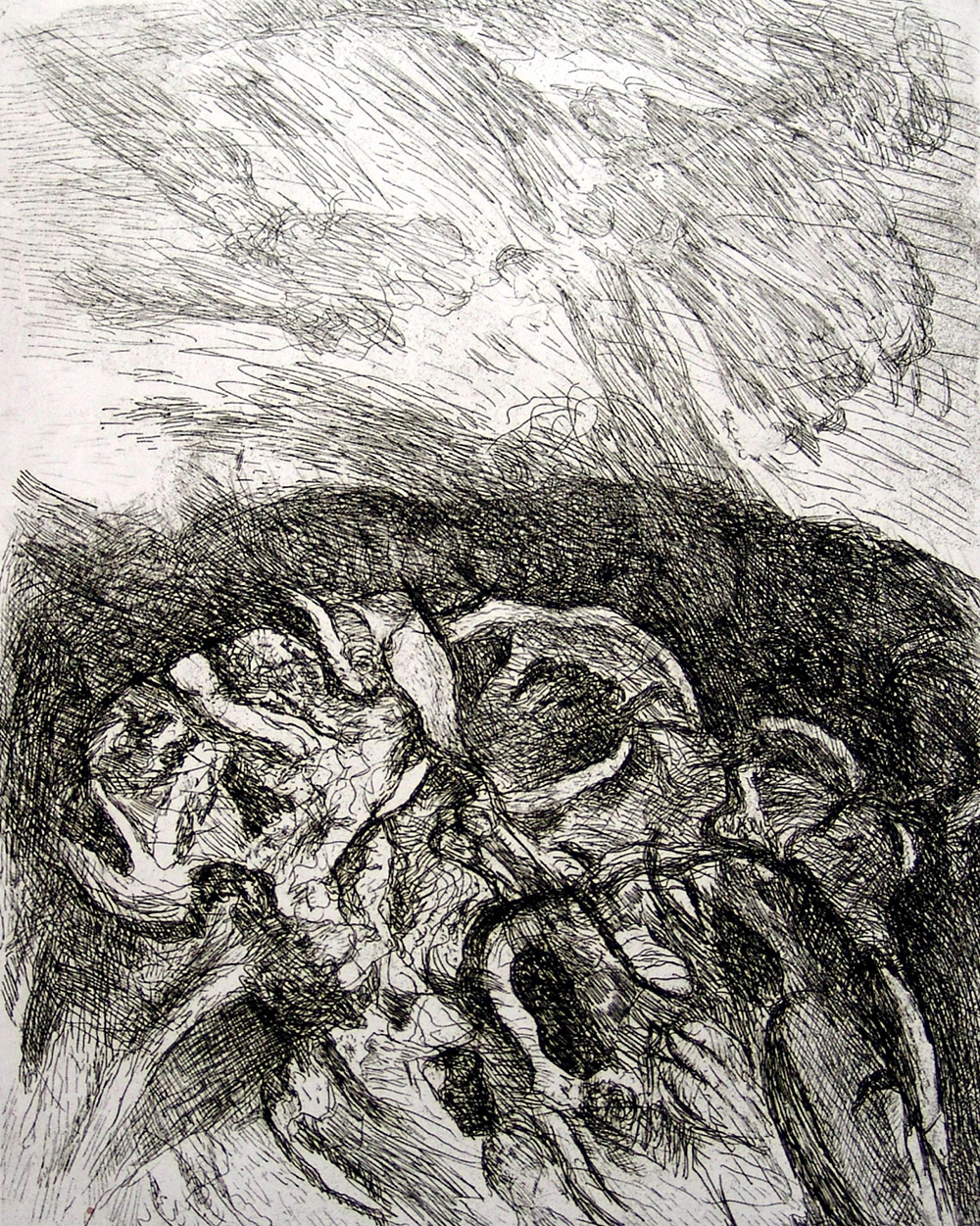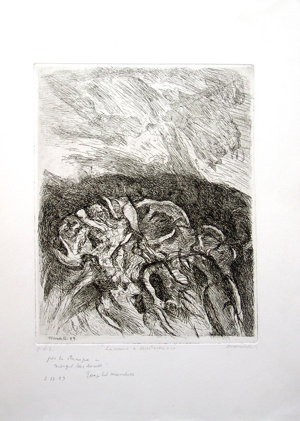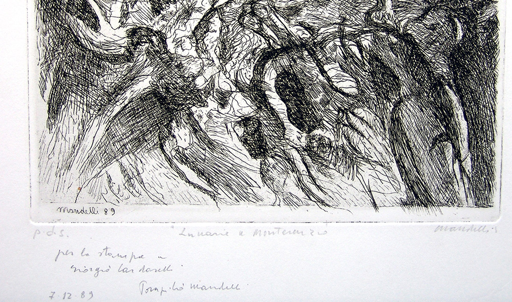 Pompilio Mandelli 1912, Luzzara (Re) - 2006, Bologna (Bo) - [Italia] Lunarie a Monterenzio acquaforte 50x35 cm 1989 es. p.d.s.; firma dell'artista in basso a destra; dedica allo stampatore Giorgio Cardarelli in basso a sinistra certificato di autenticità Picenum