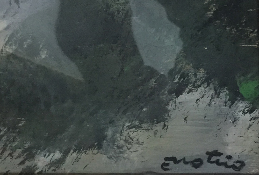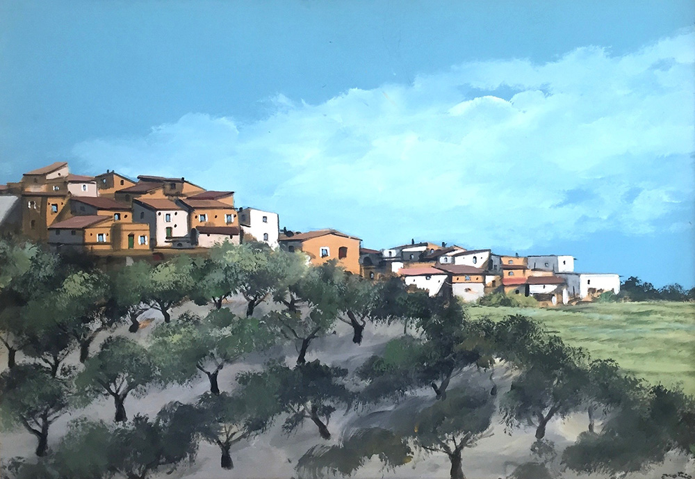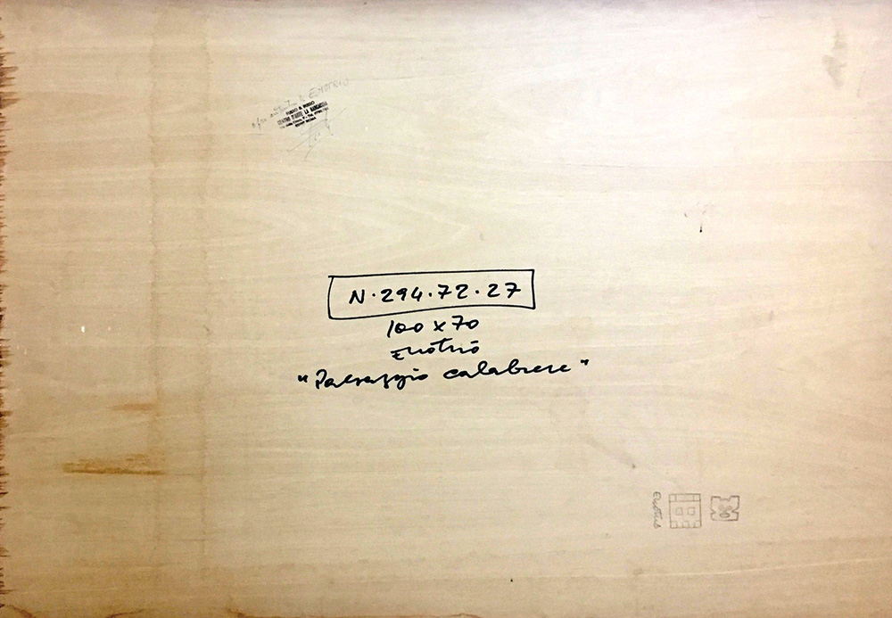 Enotrio Pugliese 1920, Buenos Aires (Argentina) - 1989, Pizzo (Vv) - [Italia] Paesaggio calabrese olio su tavola 70x100 cm 1980 firma dell'artista in basso a destra e sul retro; opera con cornice certificato di autenticità Picenum
