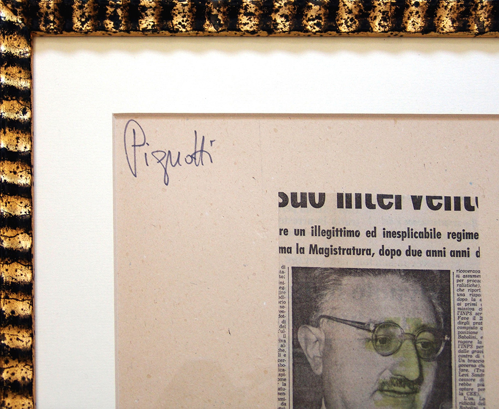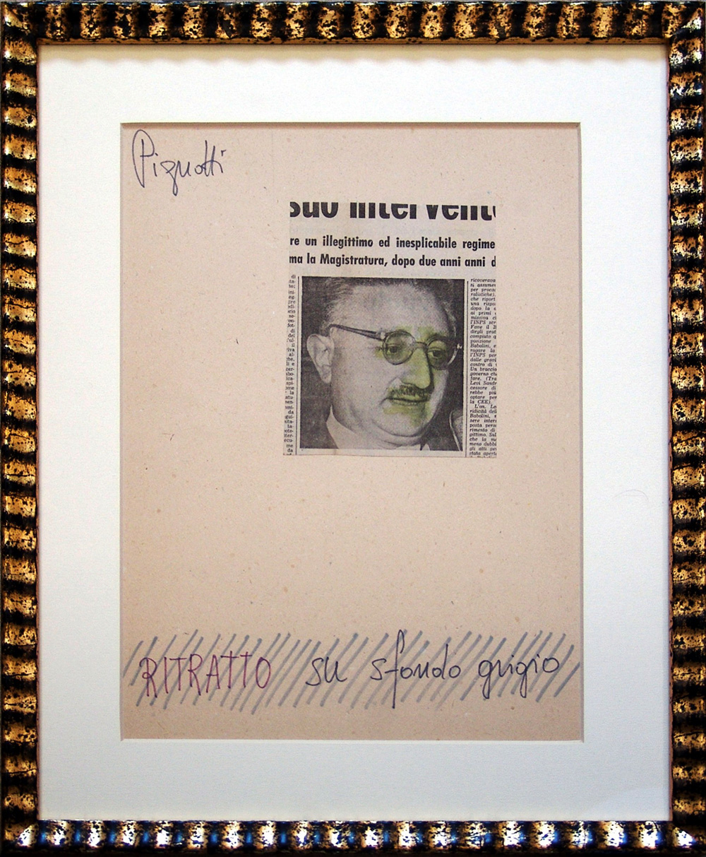 Lamberto Pignotti 1926, Firenze (Fi) - [Italia] Ritratto su sfondo grigio tecnica mista su carta 35x25 cm 1978 firma dell’artista in alto a sinistra; opera con cornice certificato di autenticità dell’artista su fotografia