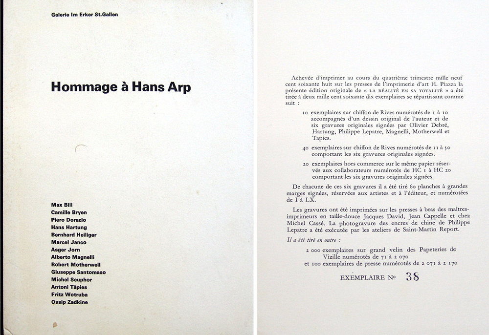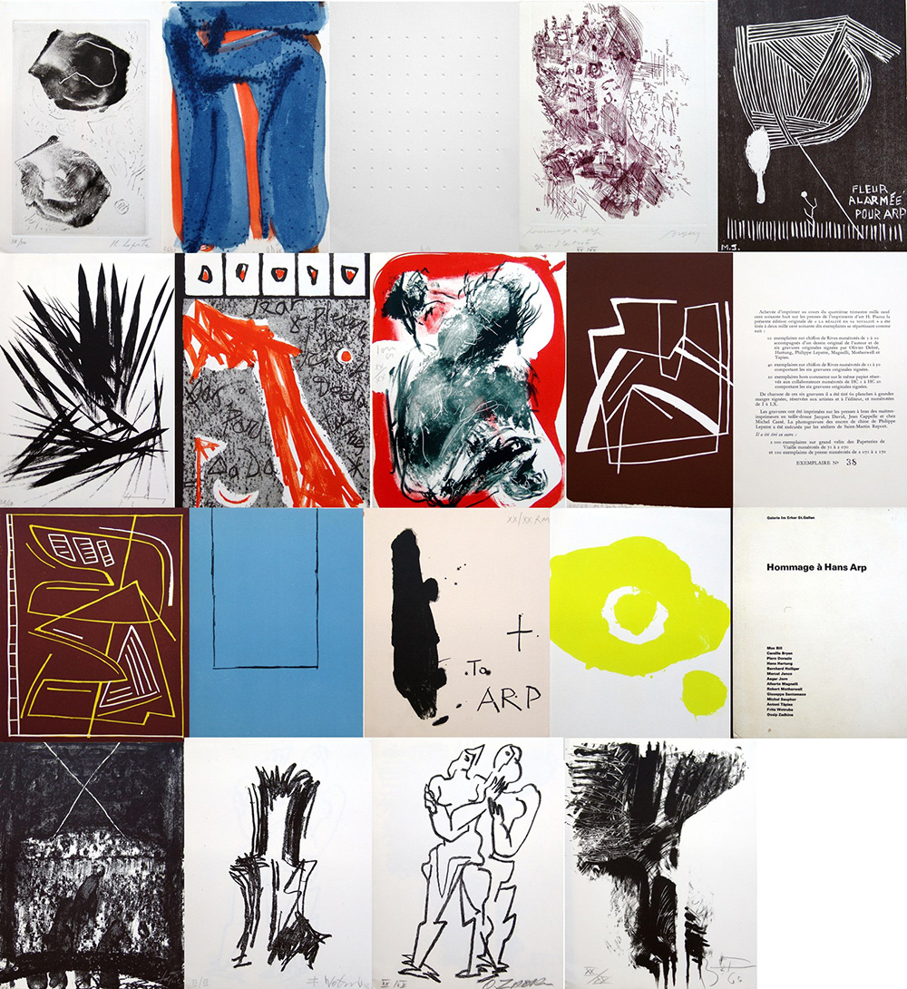 Max Bill, Camille Bryen, Hans Hartung, Marcel Janco, Asger Jorn, Philippe Lepatre, Alberto Magnelli, Robert Motherwell, Michel Seuphor, Antoni Tàpies, Fritz Wotruba, Ossip Zadkine Hommage à Hans Arp grafica varia 22,5x17,5 cm cad. 1966/1968 es. 38/50 e XX/XX; 17 grafiche di formati diversi firmate a mano dagli artisti; edizione Erker-Presse St. Gallen certificato di autenticità Picenum