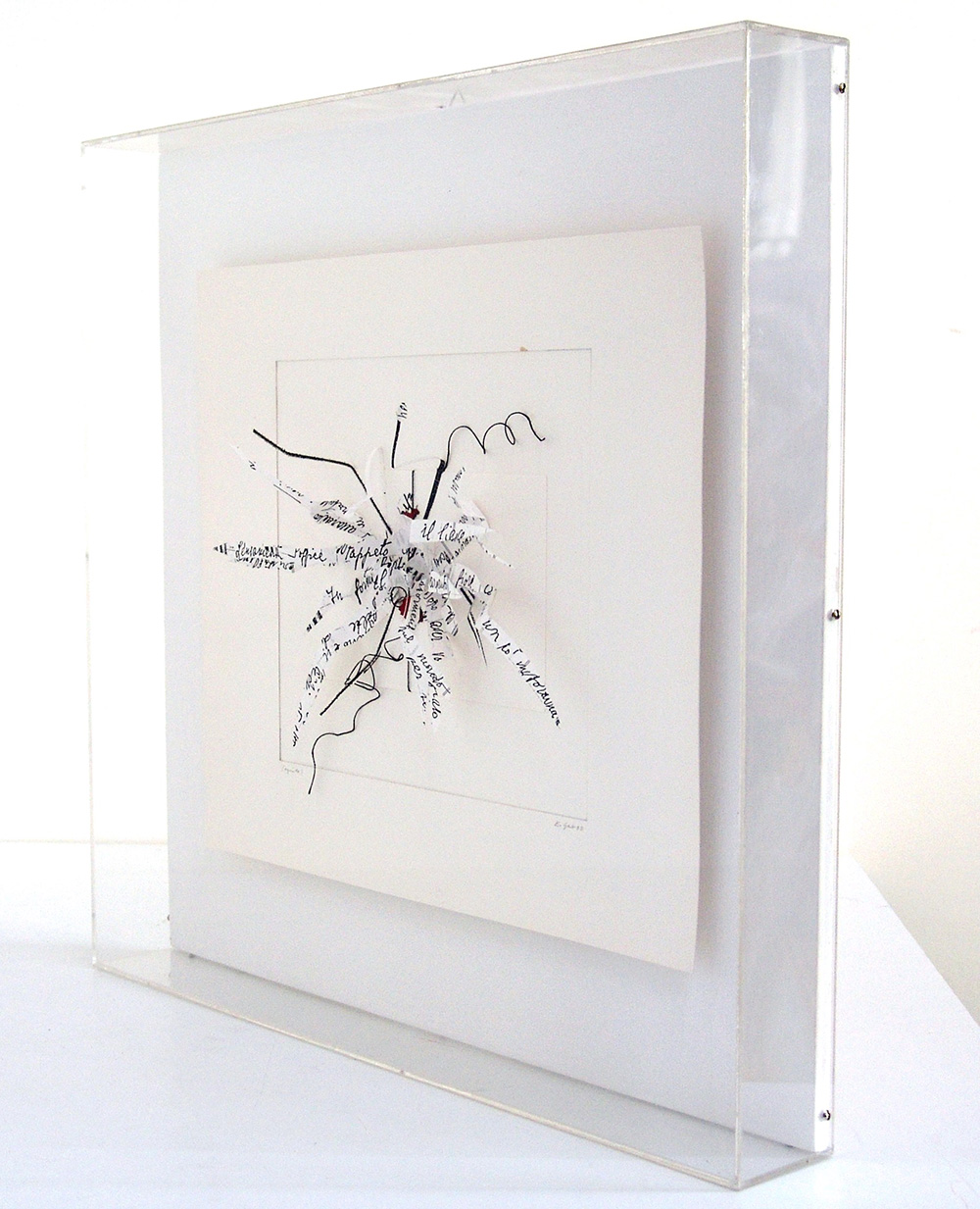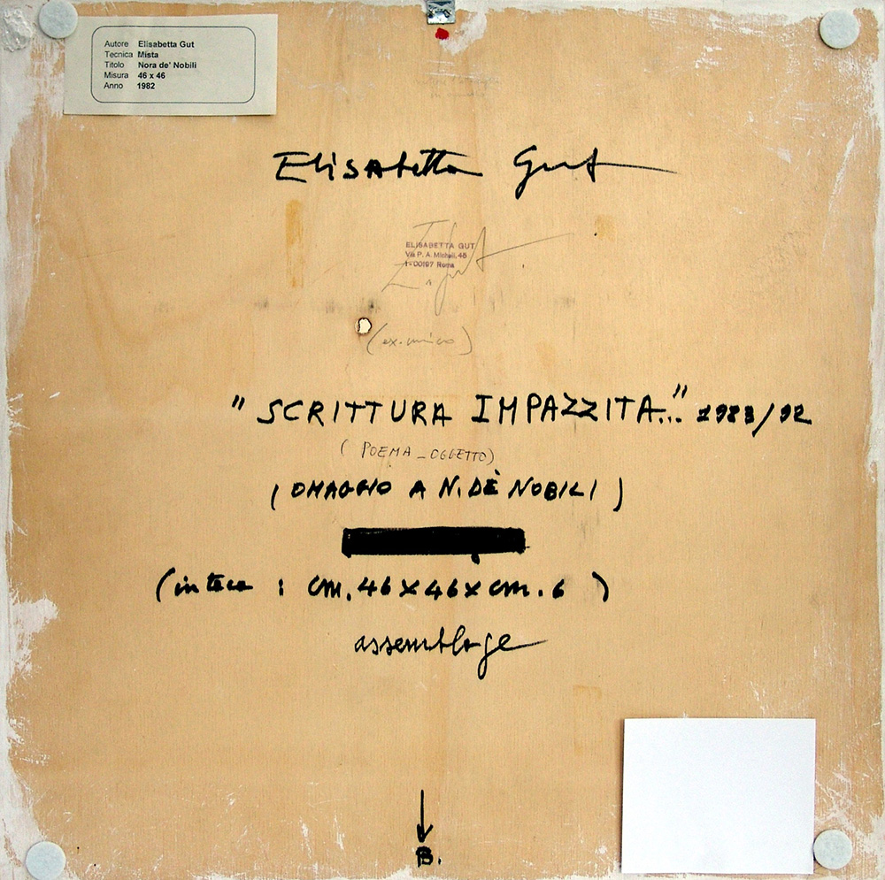 Elisabetta Gut 1934, Roma (Rm) - [Italia] Scrittura impazzita - Omaggio a Nori de' Nobili assemblaggio su carta 46x46x6 cm 1983/1992 firma dell’artista in basso a destra e sul retro; opera contenuta in teca di plexiglas certificato di autenticità della Edizioni Bora di Bologna firmato dall'artista; opera pubblicata in "Generazione anni Trenta" Edizioni Bora