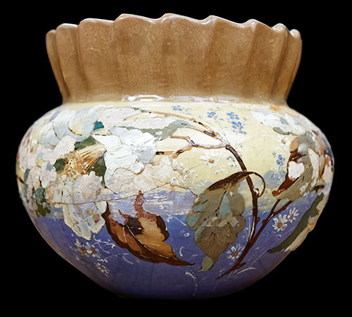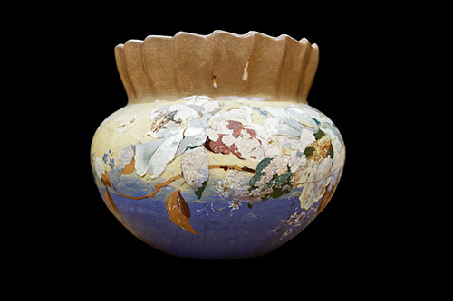 Ceramiche Florio, fine del XIX - inizio del XX secolo Cachet-pot con decori floreali policromi in rilievo Maiolica 30x35x35 cm Marca: "Cavalluccio marino" Il bene è soggetto a vincolo pertinenziale ex DDS 6852 del 30 /6/08 - 15/1 Condizione supporto: 60% Condizione superficie: 25% (caduta di larga parte della decorazione a smalti) Periodo: XIX sec. Categoria: Ceramiche