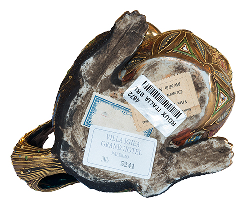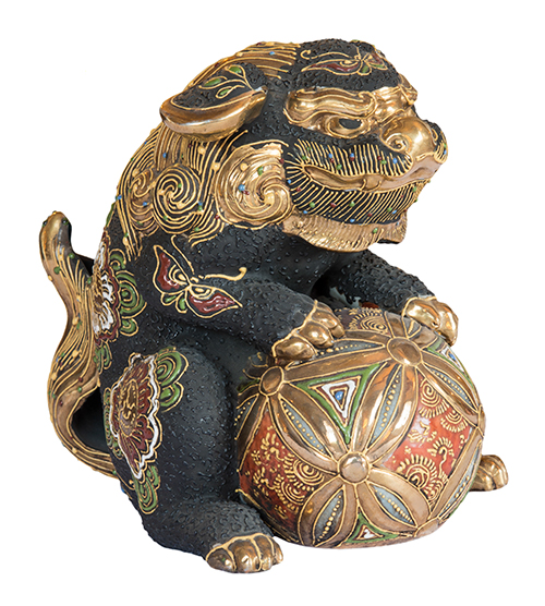Cina, inizi del XX secolo Brucia incenso sul tema del Cane di Fho Porcellana in nero e oro, cloisonné policromo 15x10,5x10,5 cm Il bene è soggetto a vincolo pertinenziale ex DDS 6852 del 30 /6/08 - 15/9 Condizione supporto: Condizione supporto: 100% (lotto non esaminato manualmente) Condizione superficie: 95% Periodo: 1900 - 1960 Categoria: Ceramiche