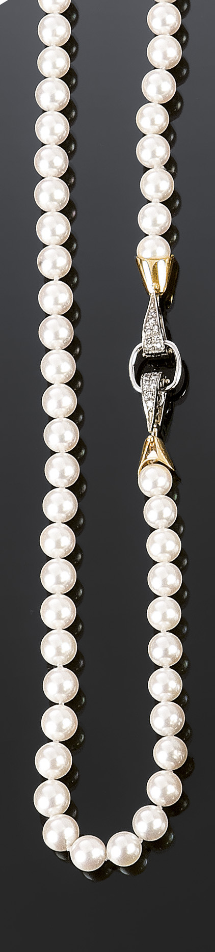 COLLANA DI PERLE Collana di perle con fermaglio in oro bianco e giallo composto da due ganci con brillantini taglio brillante rotondo