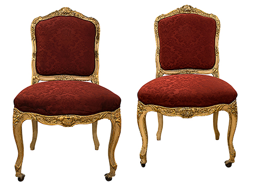 Manifattura italiana, XX secolo Coppia di sedie in stile Luigi XV Legno intagliato, laccato e dorato, imbottitura con tappezzeria in stoffa rossa 94x54,5x47 cm Il bene è libero da vincoli Condizione supporto: 80% Condizione superficie: 70% (ridipinture) 2 oggetti Una delle sedie presenta piedi anteriori dotati di rotelle Periodo: 1900 - 1960 Categoria: Mobili