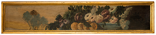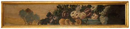 Ditta Angelo Randazzo, Palermo, I metà del XX seoolo Veduta con fiori e paesaggio Olio su tavola 25x141 cm Il bene è libero da vincoli Condizione supporto: 80% Condizione superficie: 70% (cadute di colore, crettature, depositi aderenti e non aderenti, ingiallimento vernici protettive) Periodo: 1900 - 1960 Categoria: Dipinti