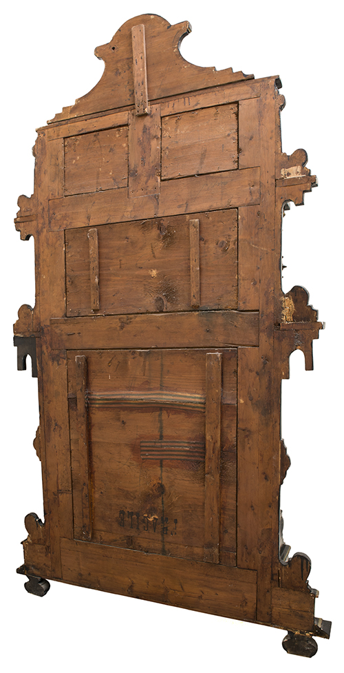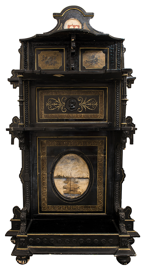 Manifattura siciliana (?), I metà del XX secolo (?) Etagere ornamentale Legno intagliato, dipinto ed ebanizzato (?) 188x101x30 cm Il bene è libero da vincoli Condizione supporto: 80% Condizione superficie: 70% (danni da usura, in particolare alle parti basse, cadute di colore e danni da urti) Etagere di forma mossa decorata con medaglioni dipinti a paesaggi ed ornamenti floreali stilizzati Periodo: 1900 - 1960 Categoria: Mobili