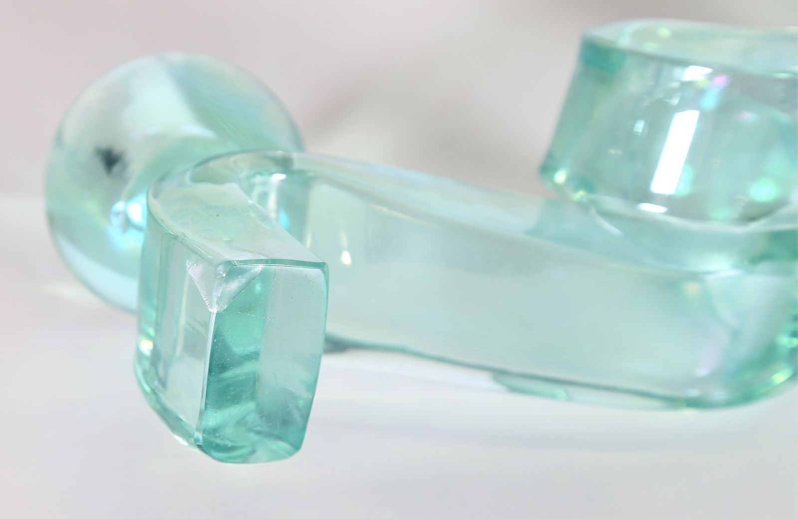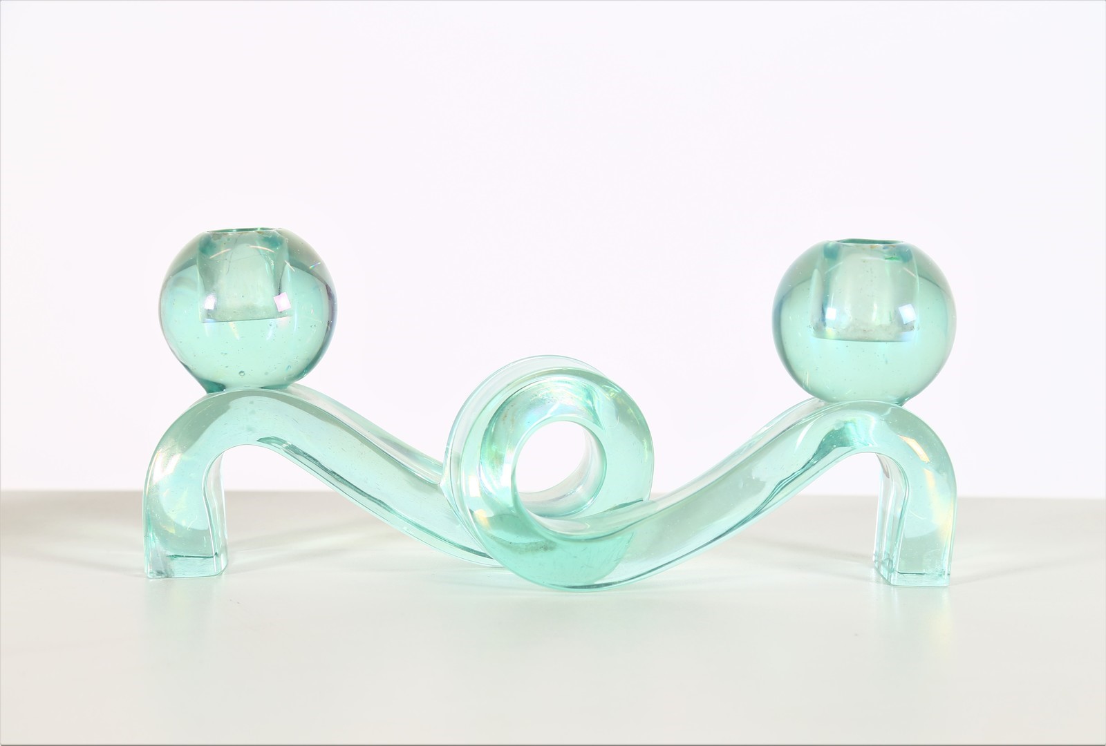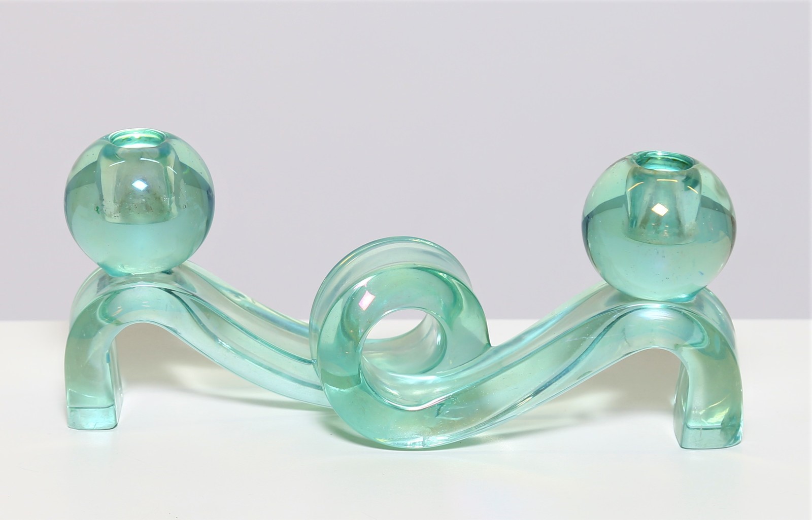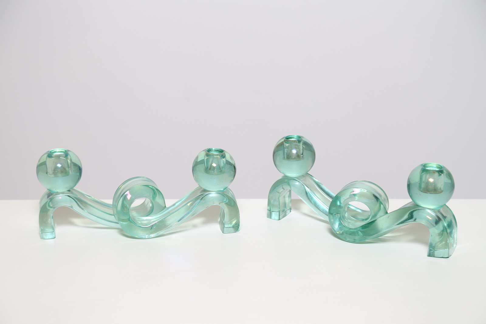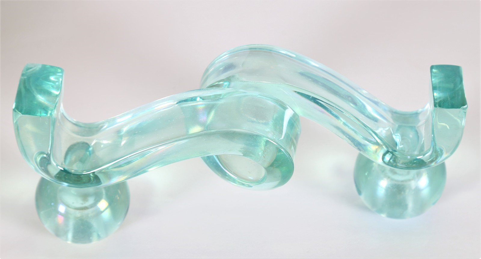 POLI FLAVIO (1900 - 1984) Pair of candlesticks. . Cm 30,00 x 12,00 x 9,00. Pair of two-light candle holders in iridescent full "north green" glass, worked to ingot, mod. 3910, for Seguso Vetri D'Arte, 1937. Publications: "Seguso Vetri D'Arte" by Marc Heiremans, pg. 88.