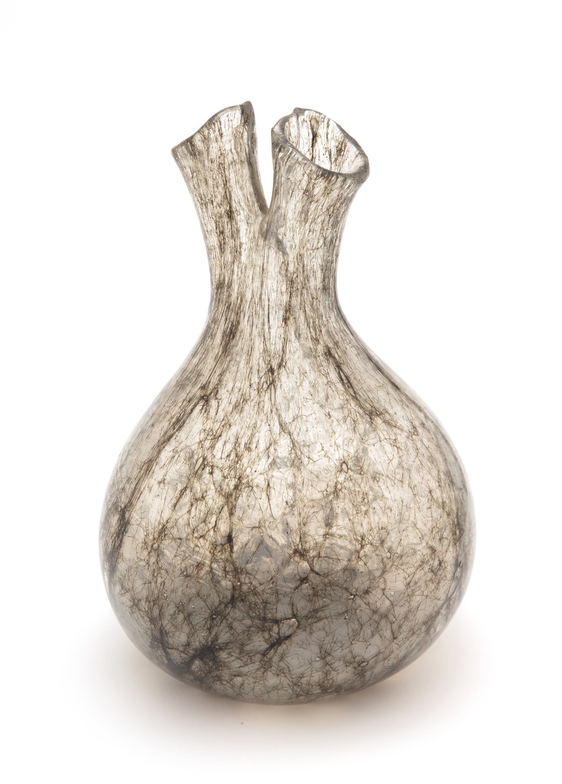 BAROVIER ERCOLE (1889 - 1974) Vaso Crepuscolo. -. Cm 19,00 x 26,00. Vetro trasparente con inclusioni di filamenti metallici, della serie Crepuscolo, per Ferro Toso Barovier, fine anni 30. Pubblicazioni: "Ercole Barovier 1888- 1974: Vetraio Muranese", Attilia Dorigato, ed. Marsilio pag. 61 illustra questa tecnica.