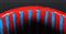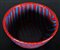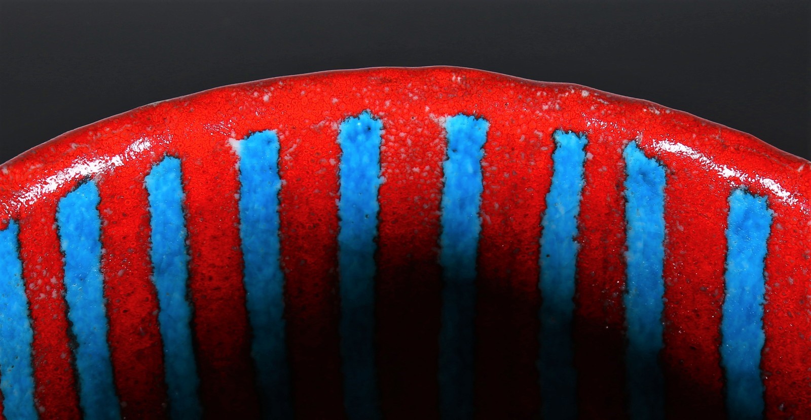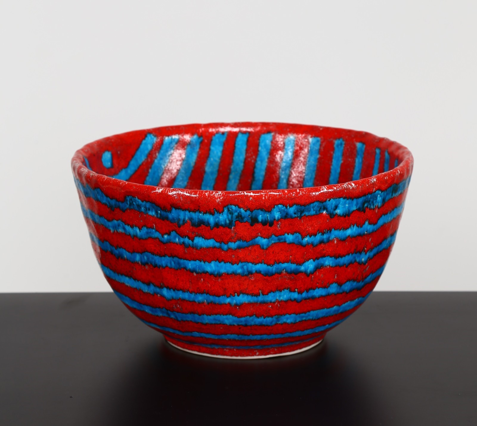GAMBONE GUIDO (1909 - 1969) Bowl. . Cm 27,00 x 15,00 x 27,00. Red and blue striped ceramic, 1950s. Signature on base with "little donkey" symbol.