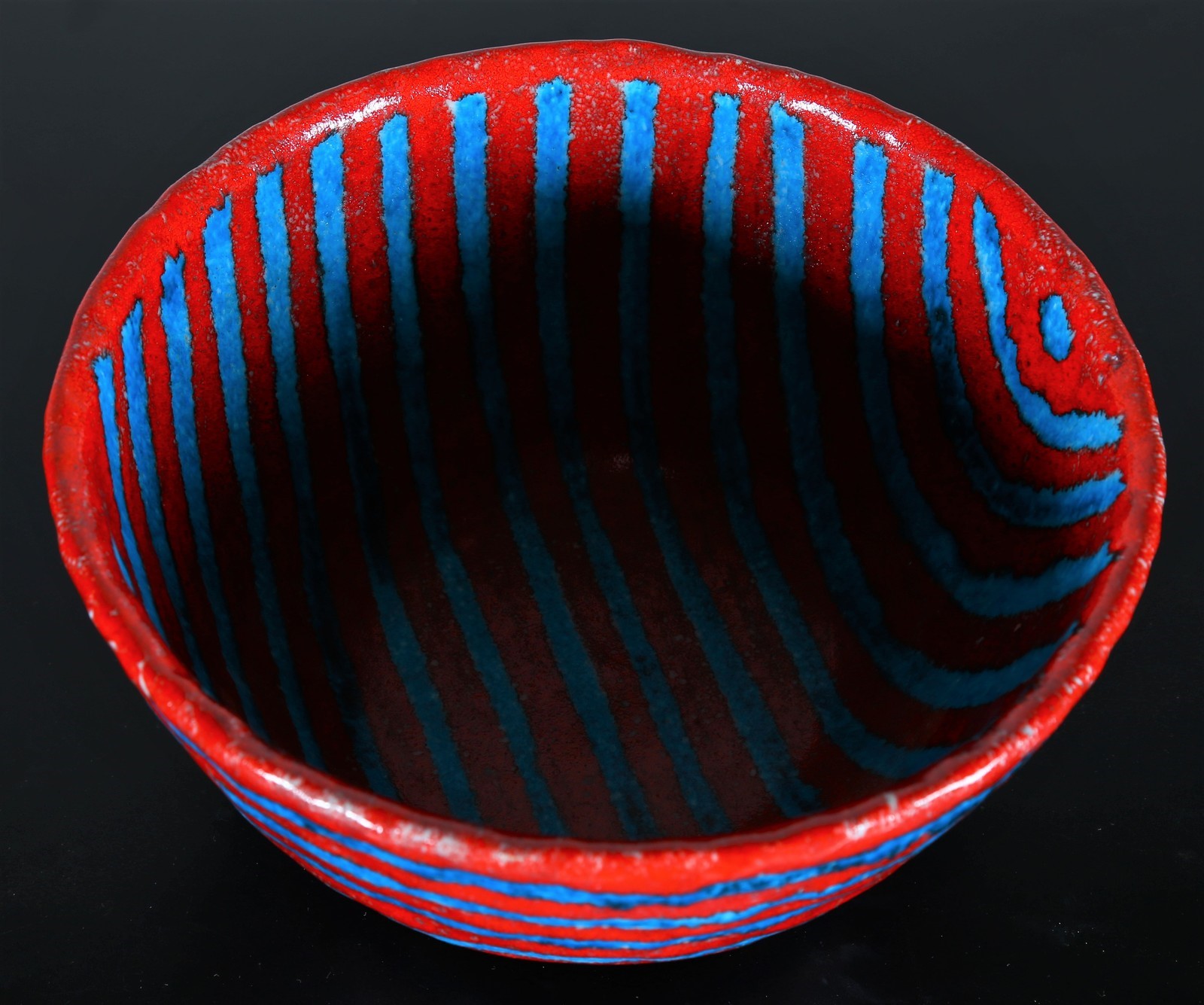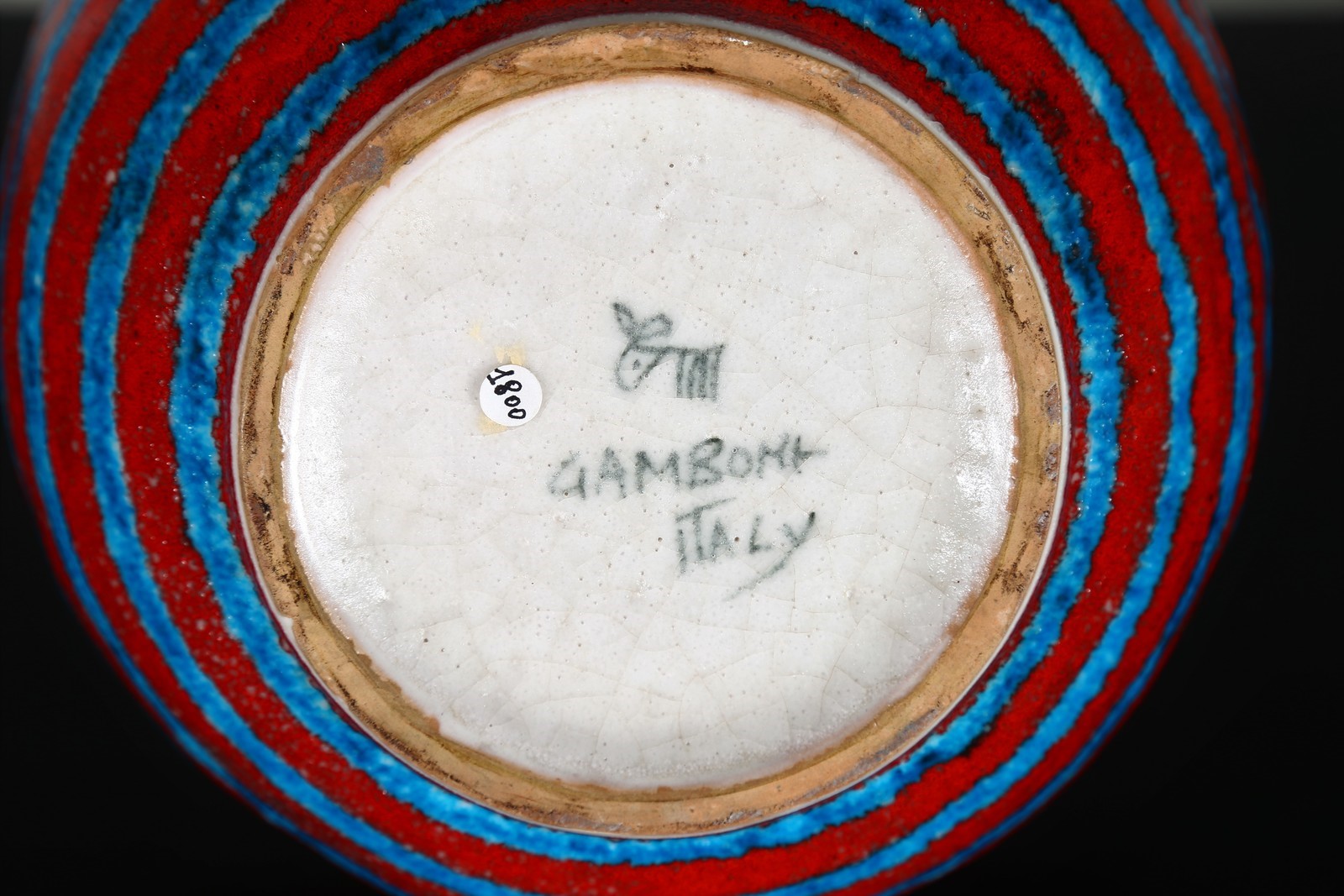 GAMBONE GUIDO (1909 - 1969) Ciotola. -. Cm 27,00 x 15,00 x 27,00. Ceramica a righe rosse e blu anni 50. Firma presente alla base con simbolo Asinello.