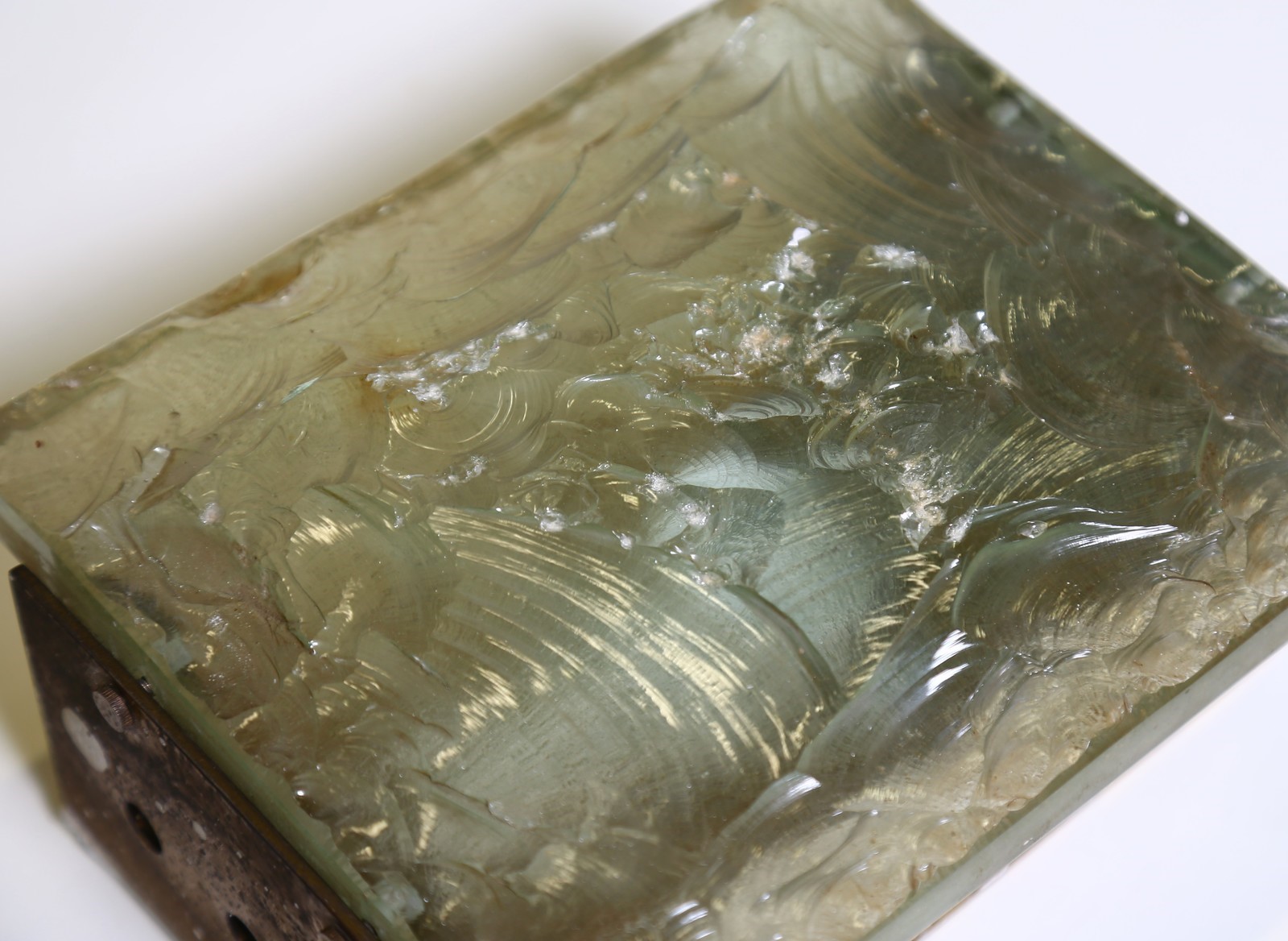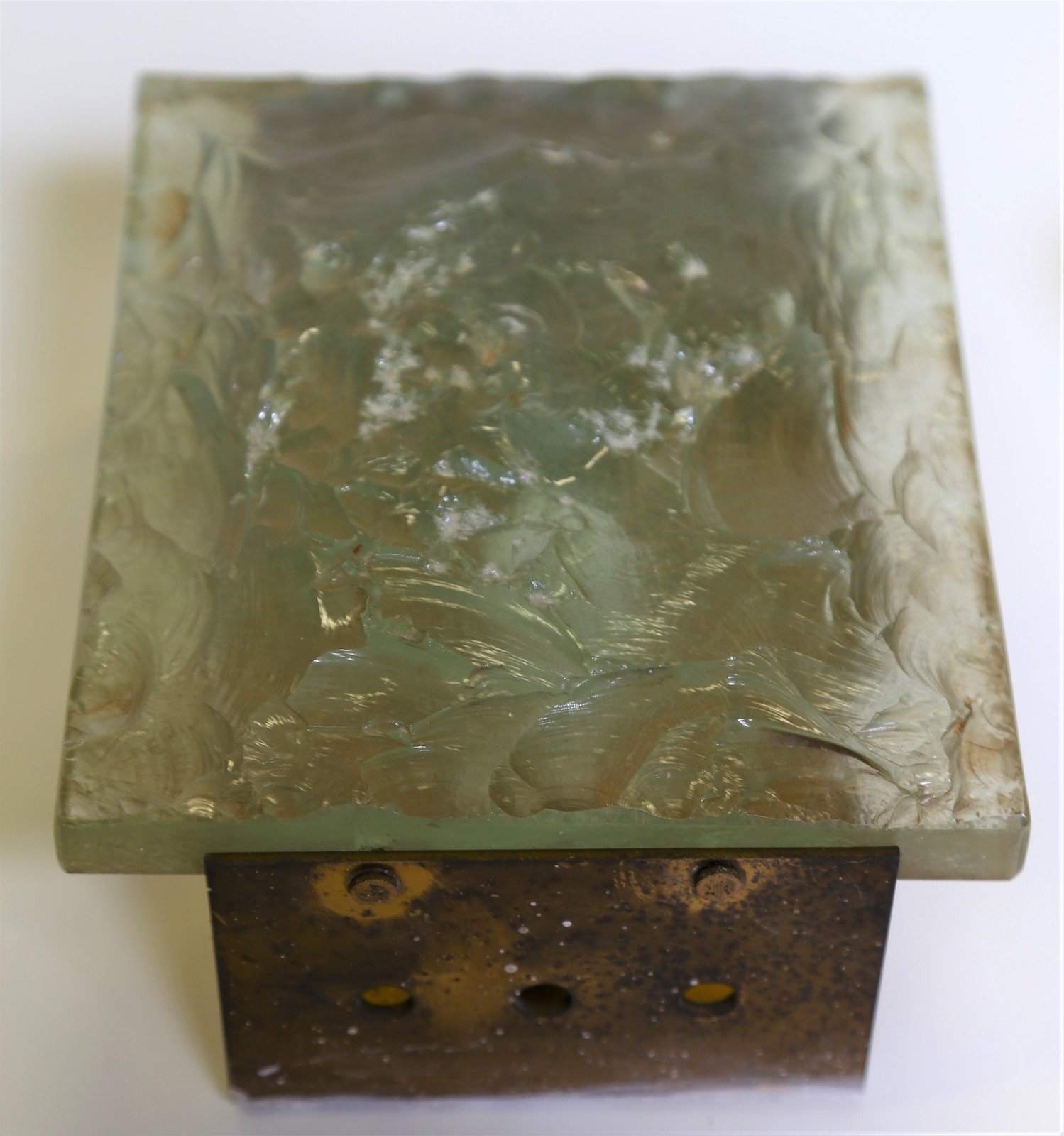 INGRAND MAX (1908 - 1969) Coppia di applique mod. 2311. -. Cm 17,00 x 20,00 x 9,00. Vetro scalpellato e ottone, per Fontana Arte, anni 50. Pubblicazioni; Quaderno Fontana Arte n°6 (1964), pag. 76.