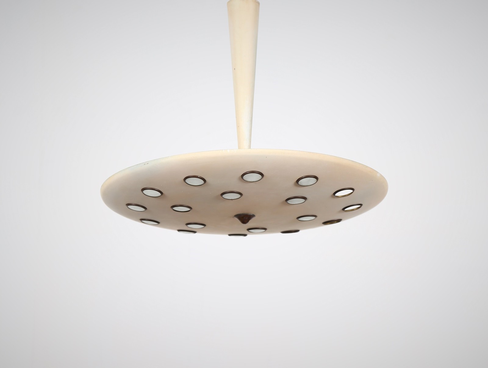 LUMEN MILANO Ceiling lamp. . Cm 49,00 x 62,00 x 49,00. Lacquered metal, brass and frosted glass, 1950s.
