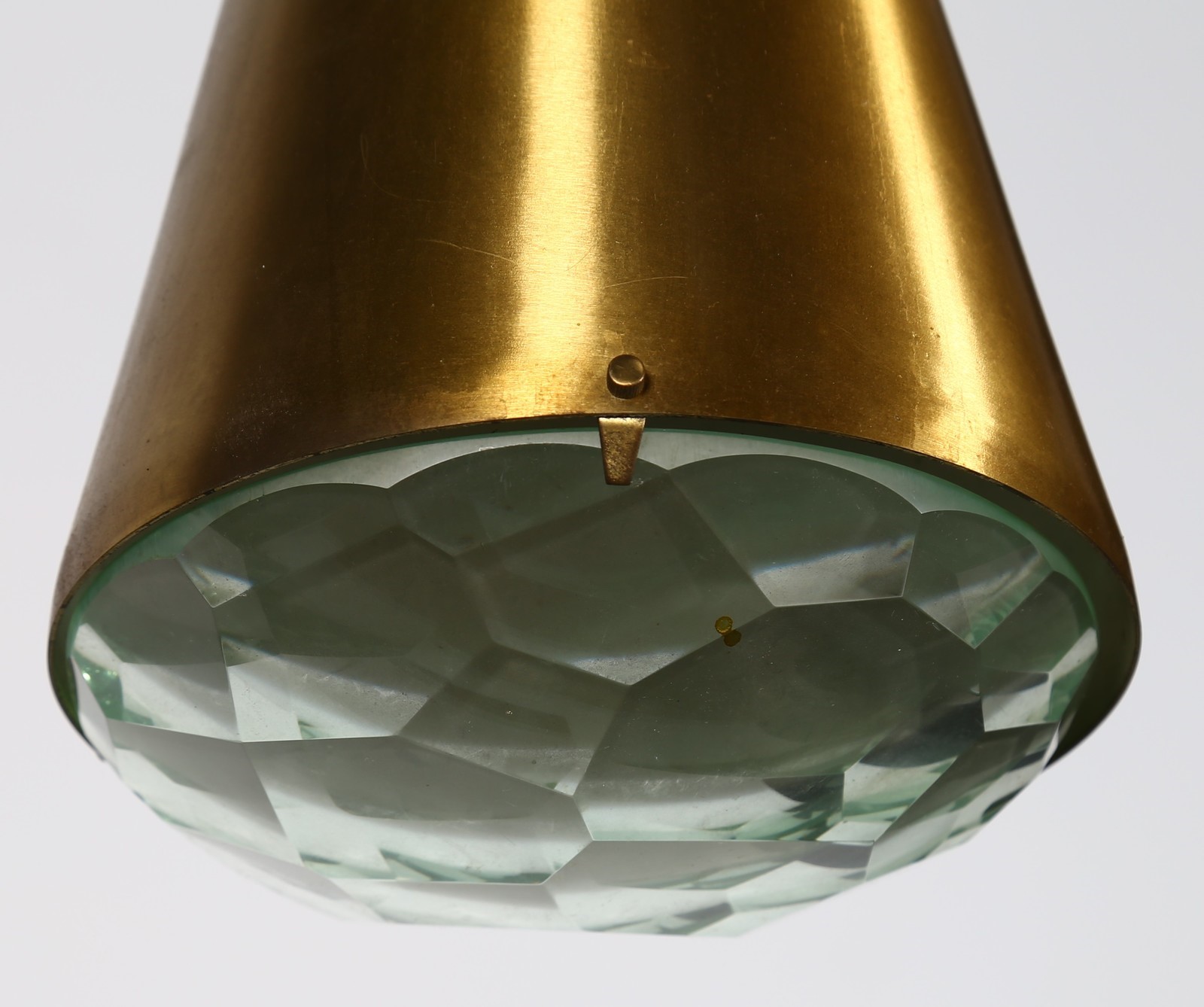 INGRAND MAX (1908 - 1969) Pendant light, mod. 1995. fritware with underglaze and overglaze painted decoration. Cm 18,00 x 34,00 x 18,00. Nickel-plated brass with crystal diffuser, for Fontana Arte, 1960s. Publications: Quaderni Fontana Arte no. 6; F. Deboni, Fontana Arte, Gio Ponti, Pietro Chiesa, Max Ingrand, Allemandi, 2012, fig. 221.