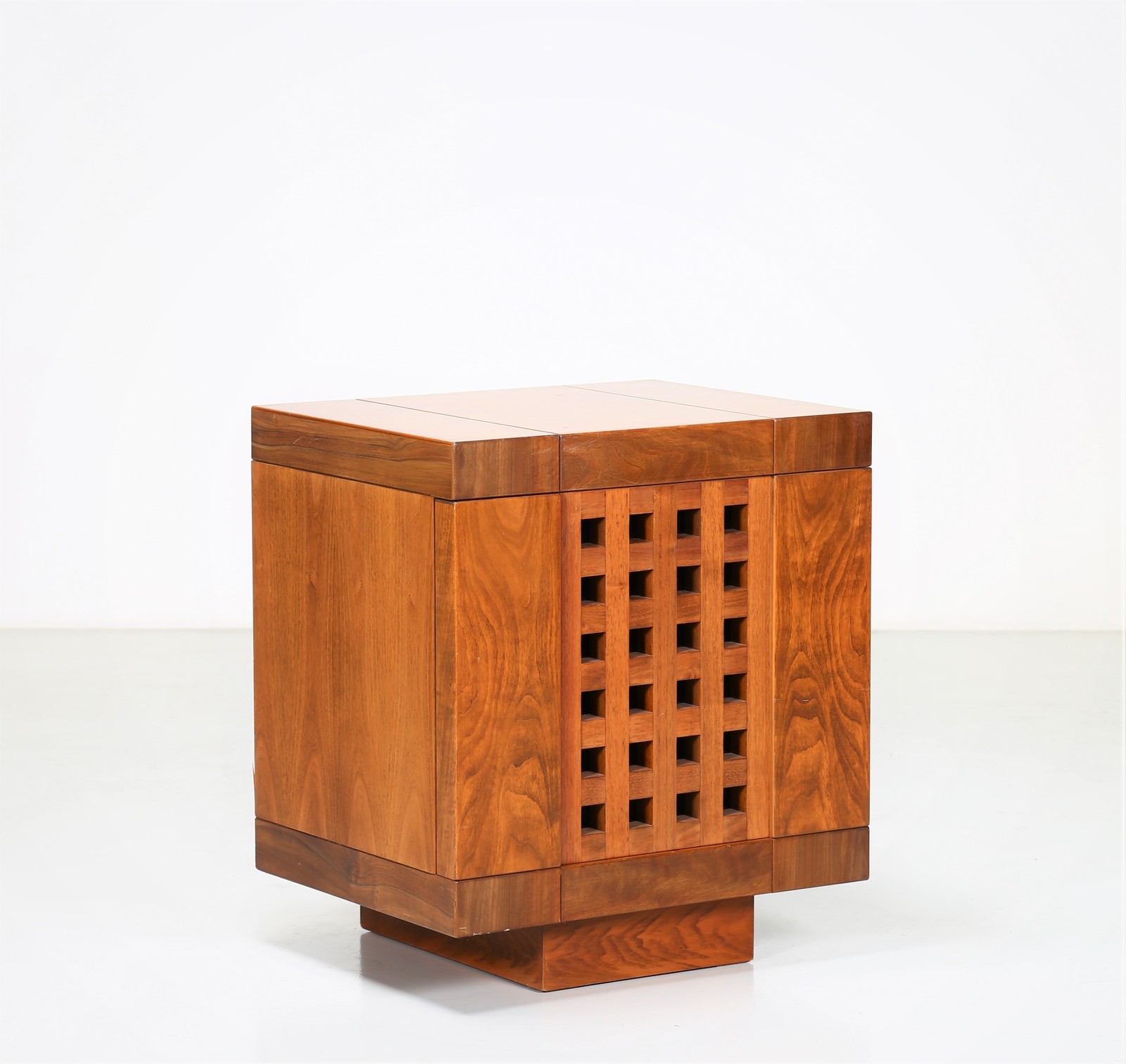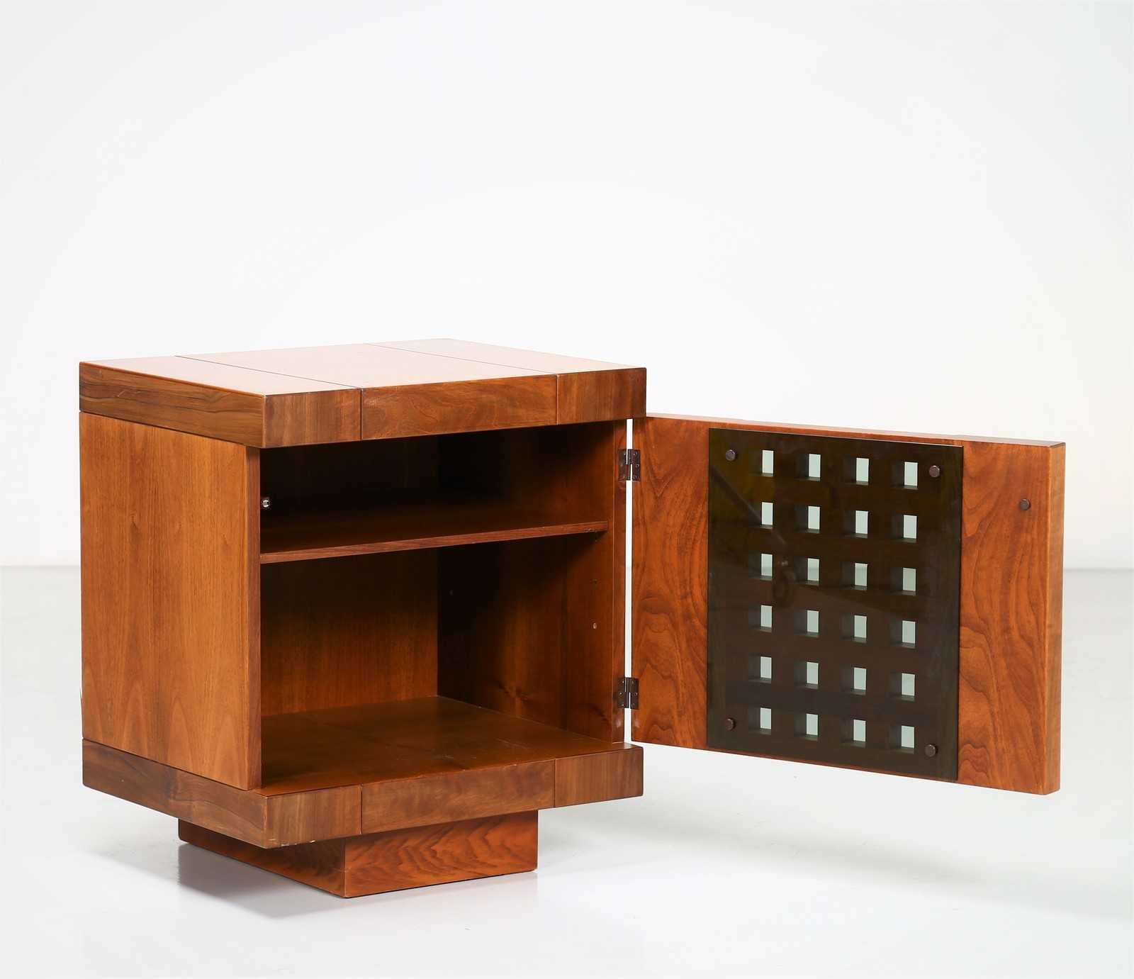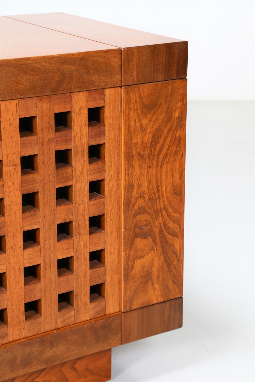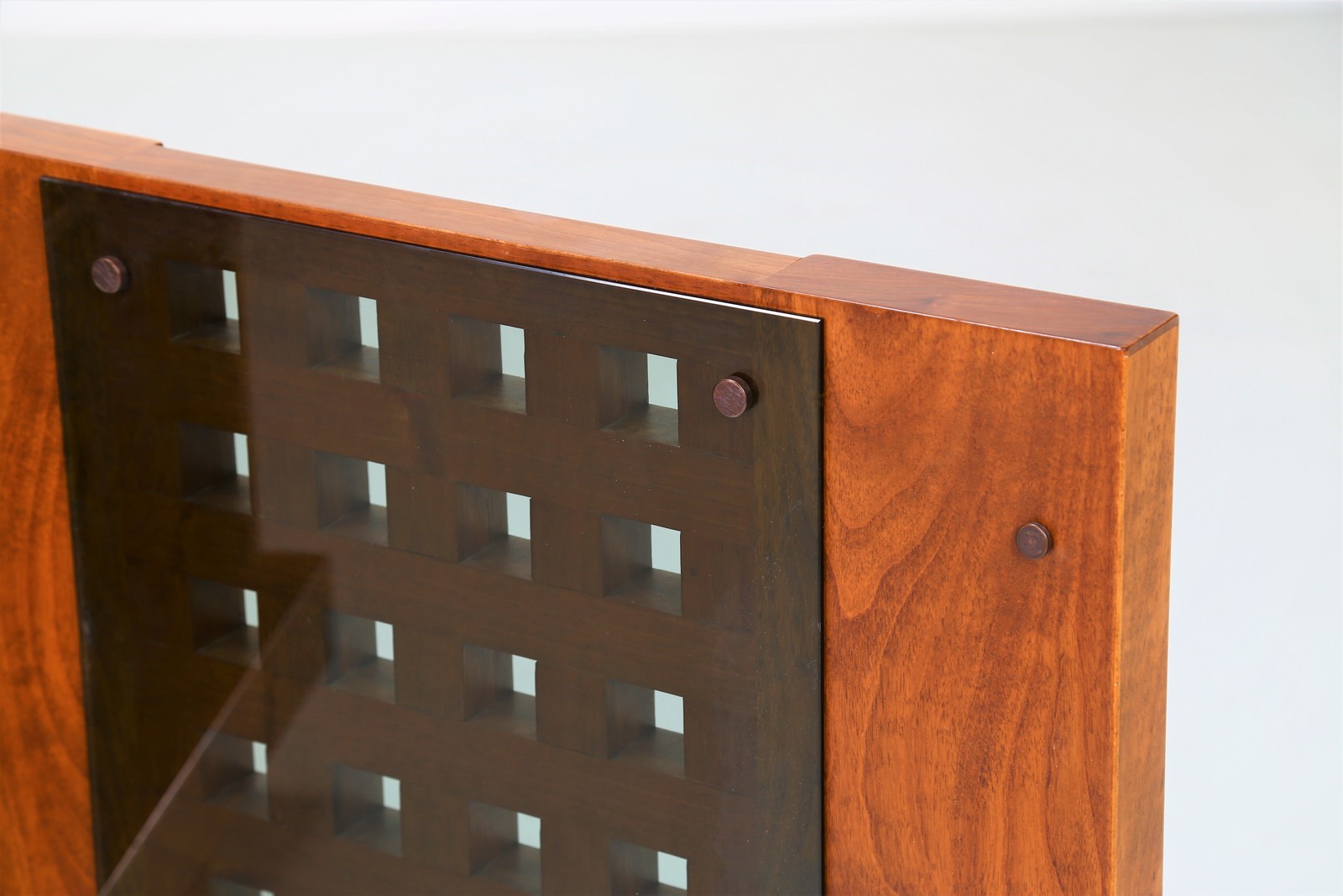MECCANI ARREDAMENTI Cabinet with grille door. . Cm 70,00 x 78,50 x 55,00. Walnut and glass, part of the exclusive furniture of Casa G. Brescia, late 1970s.