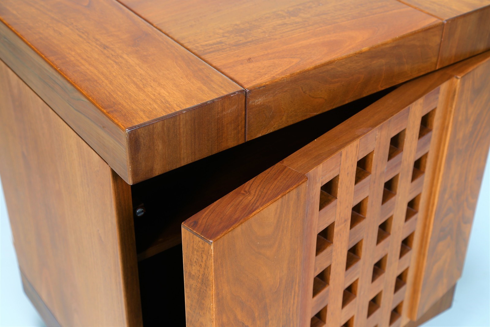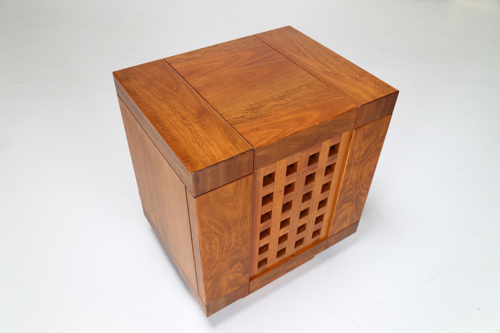 MECCANI ARREDAMENTI Mobiletto con anta a griglia . -. Cm 70,00 x 78,50 x 55,00. Legno di noce e vetro, parte di esclusivo arredo Casa G. Brescia fine anni 70.