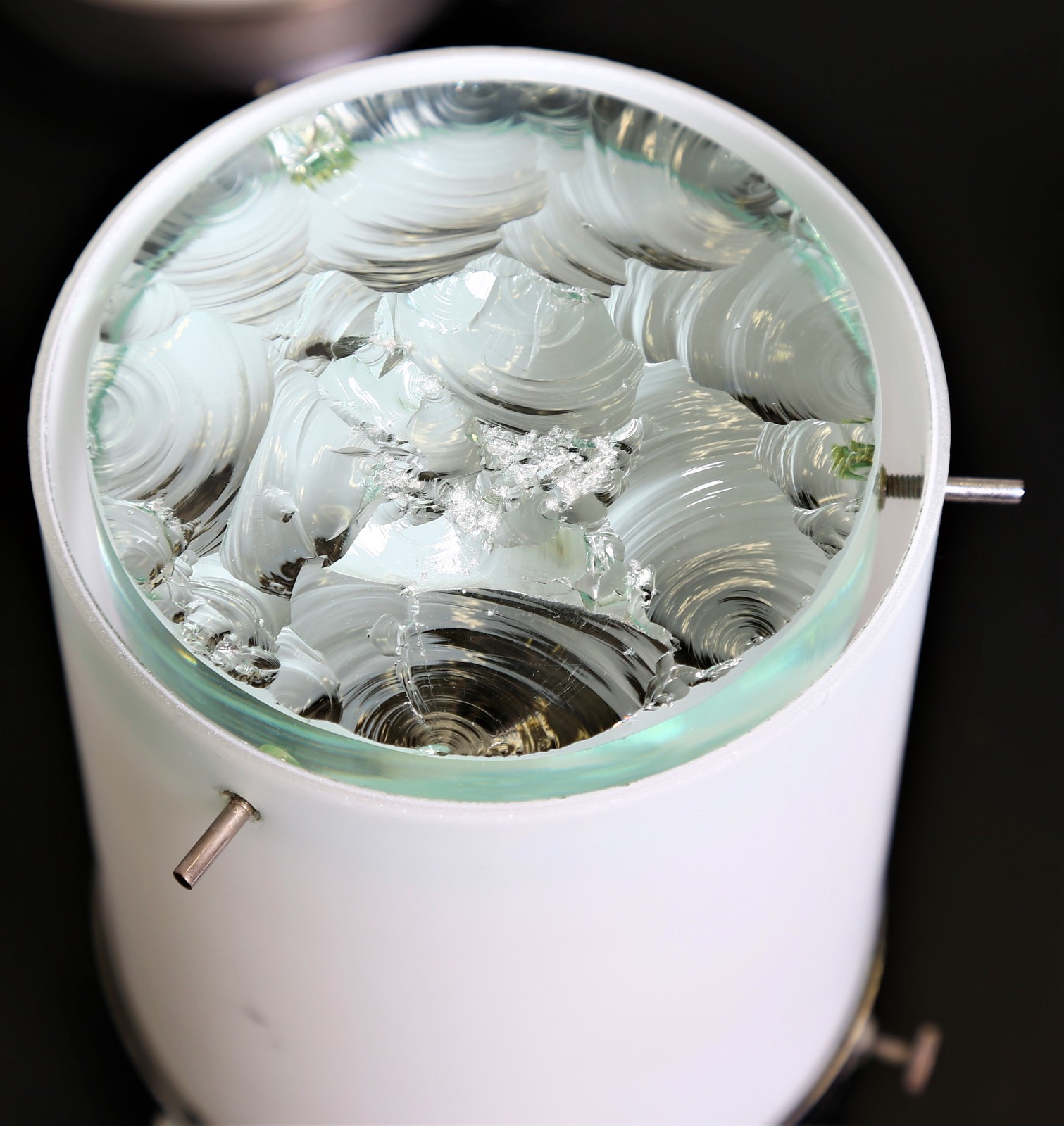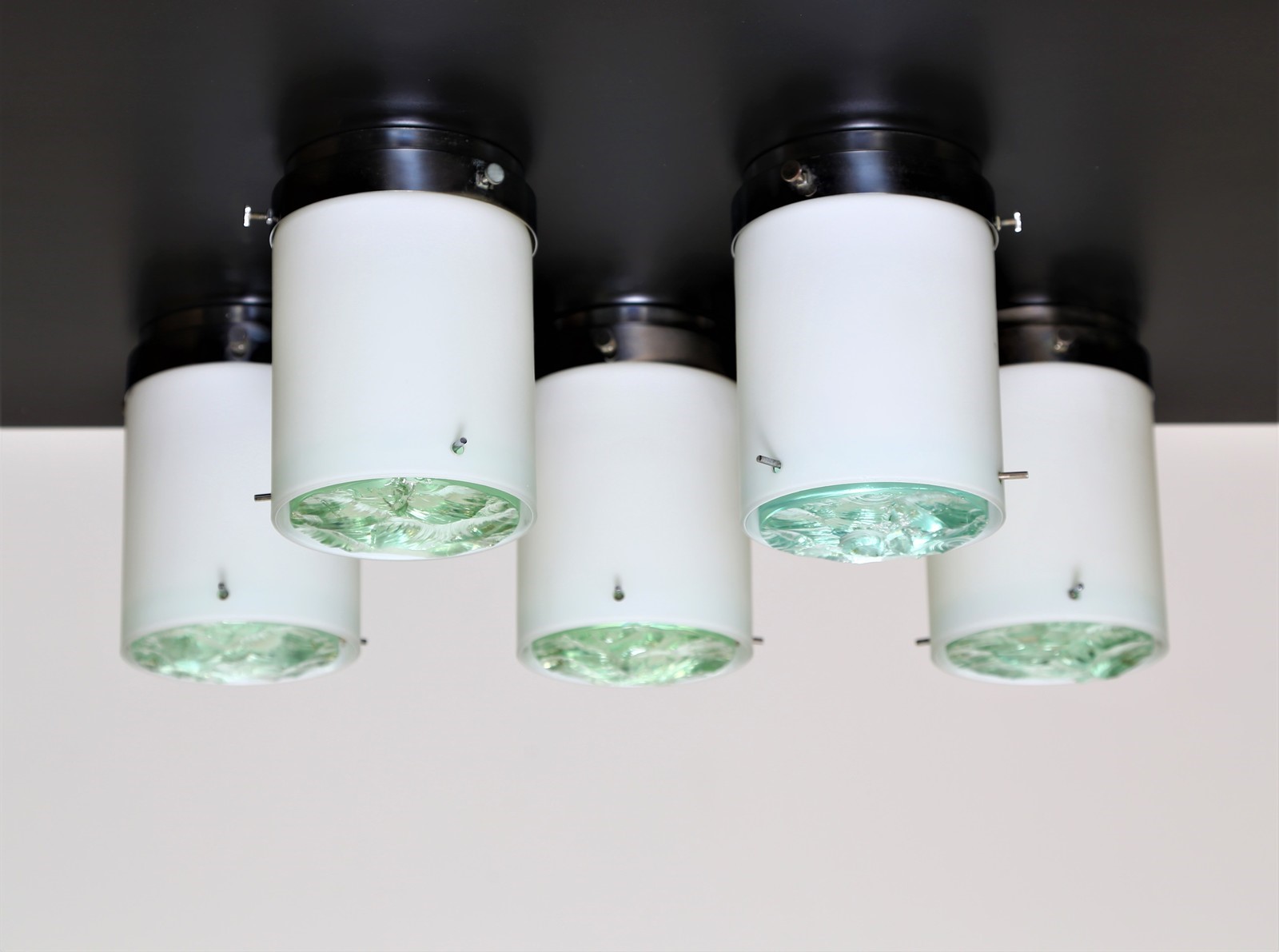 INGRAND MAX (1908 - 1969) Five ceiling lights, mod. 2494. . Cm 11,00 x 16,00 x 11,00. Steel supports, with frosted incamiciato milk glass diffusers, chiselled crystal screen, mod. 2494, for Fontana Arte, 1960s.