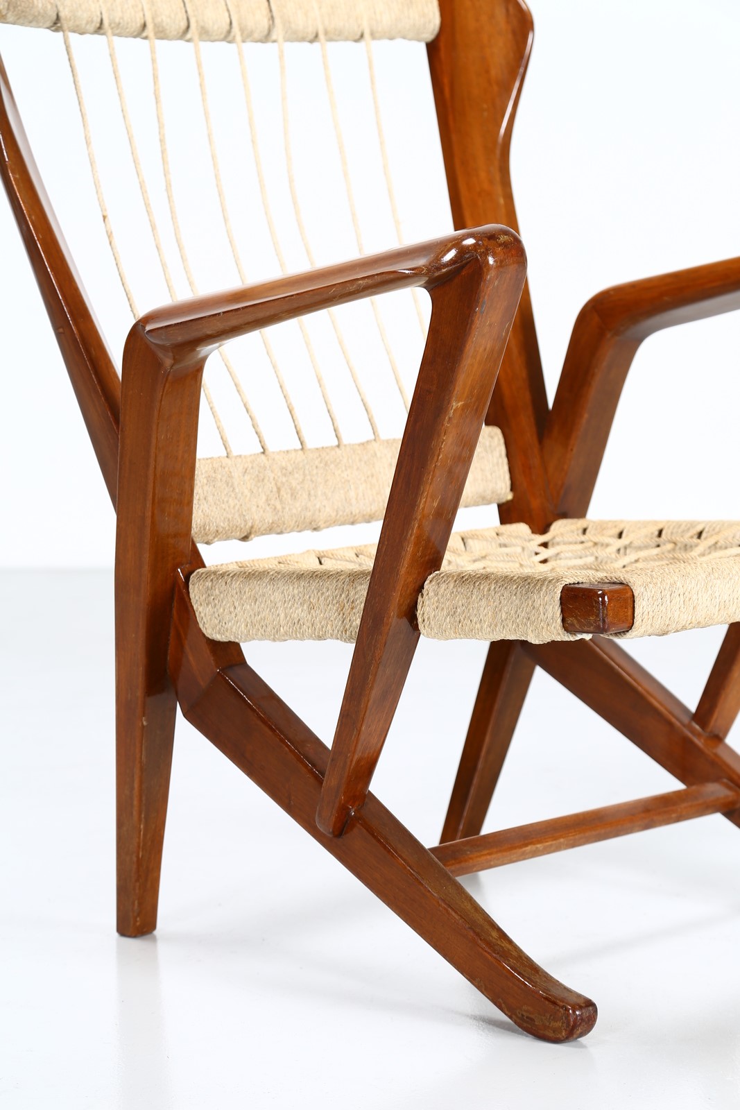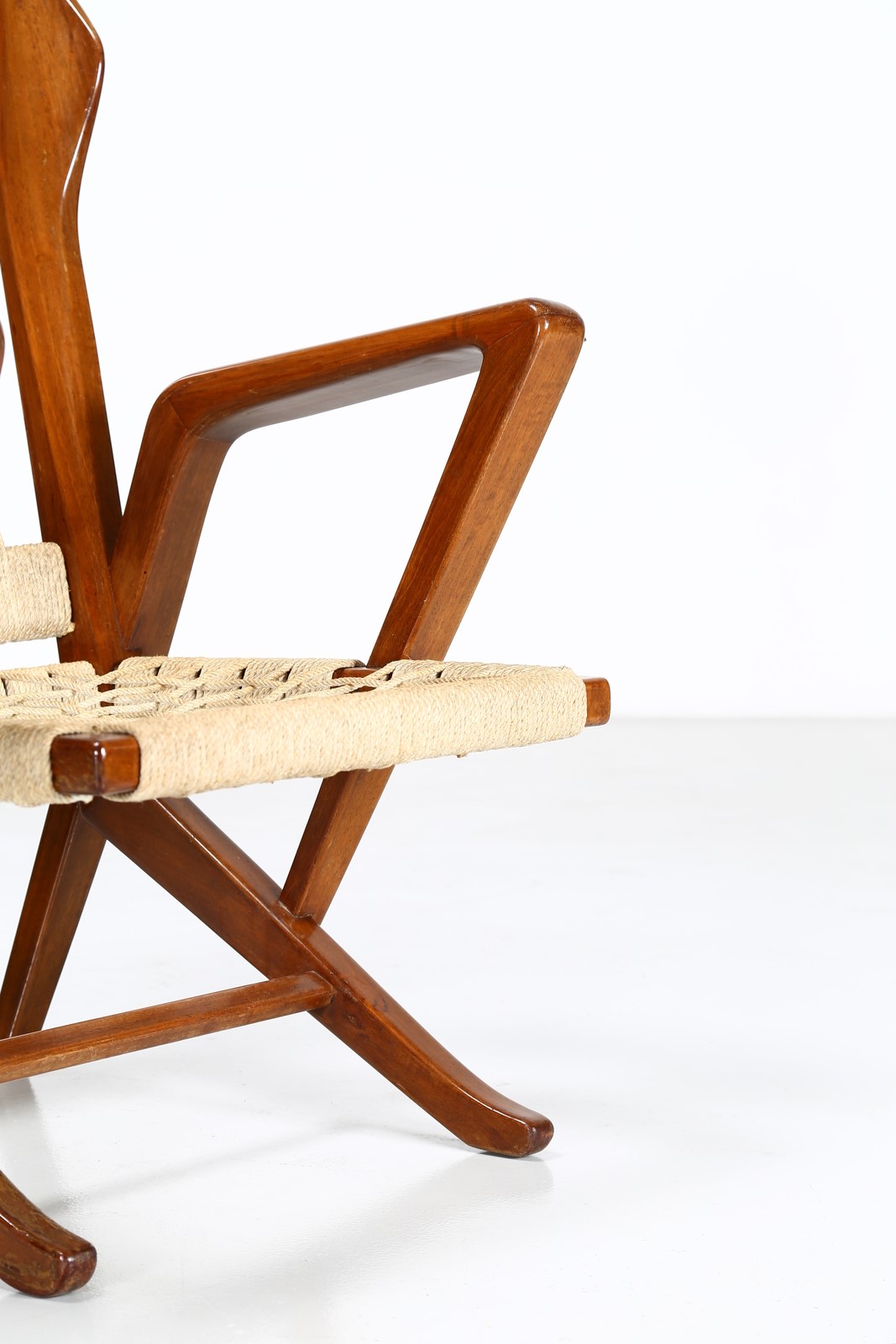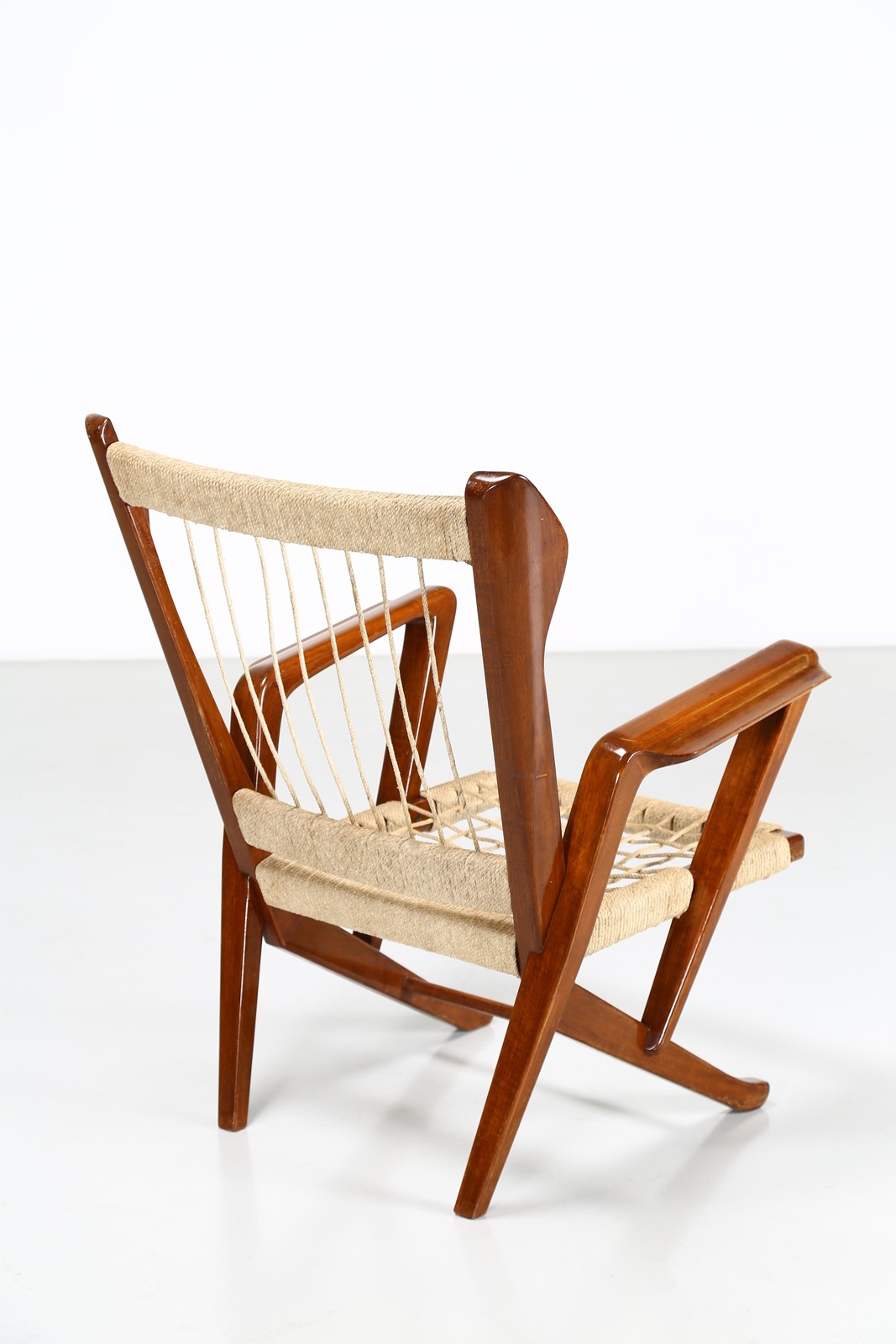 PECORINI GUGLIELMO Armchair. . Cm 80,00 x 96,00 x 76,00. Walnut wood and rope, "Edizioni I Due Forni", Florence, 1940s. Publications: Domus no. 173, May 1942, chair model.