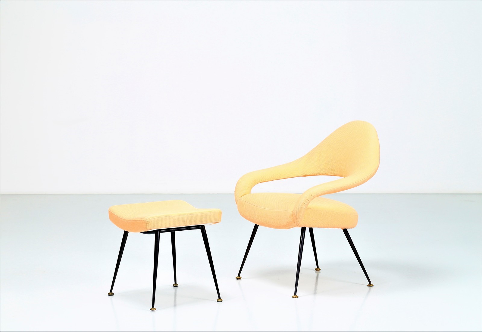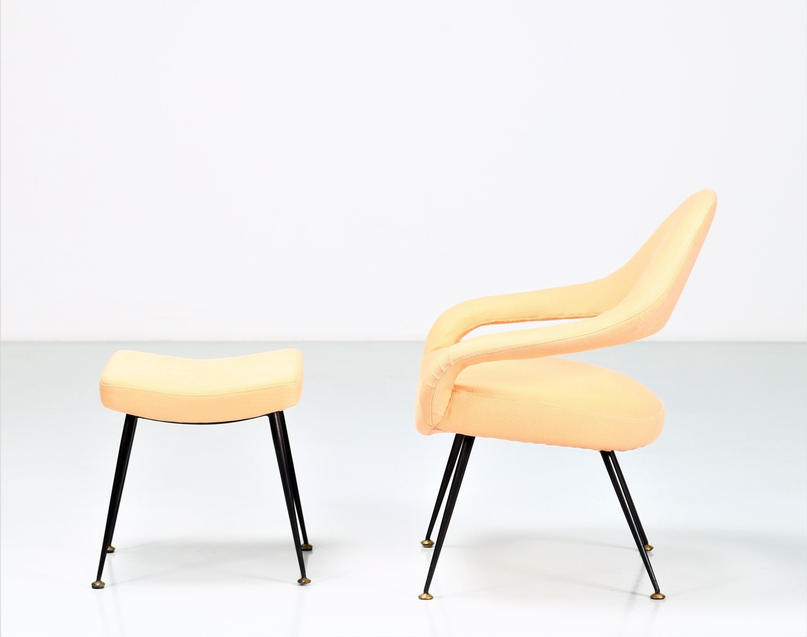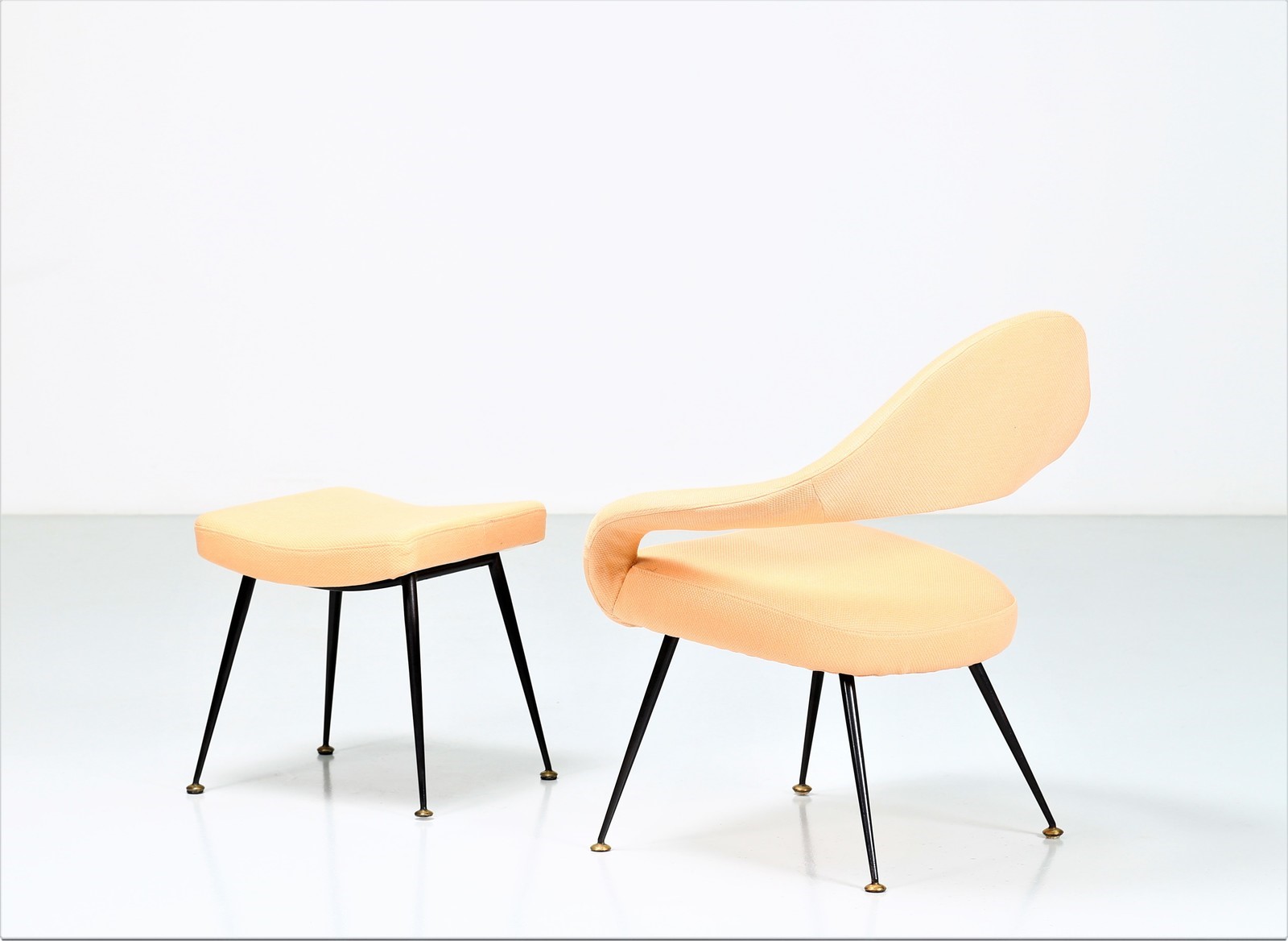 RINALDI GASTONE Armchair with footrest, mod. Du 55P. . . . Fabric, lacquered iron rod and brass, for Rima, 1955. Publication: Gastone Rinaldi Designer alla Rima, edited by Giuseppe and Jacopo Drago, pg. 183