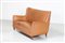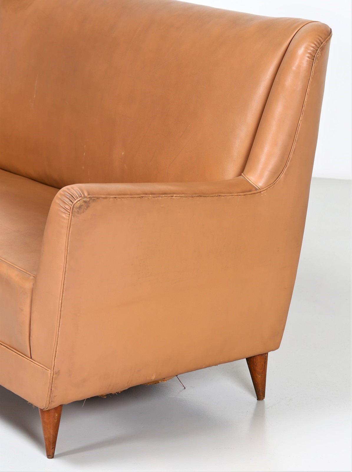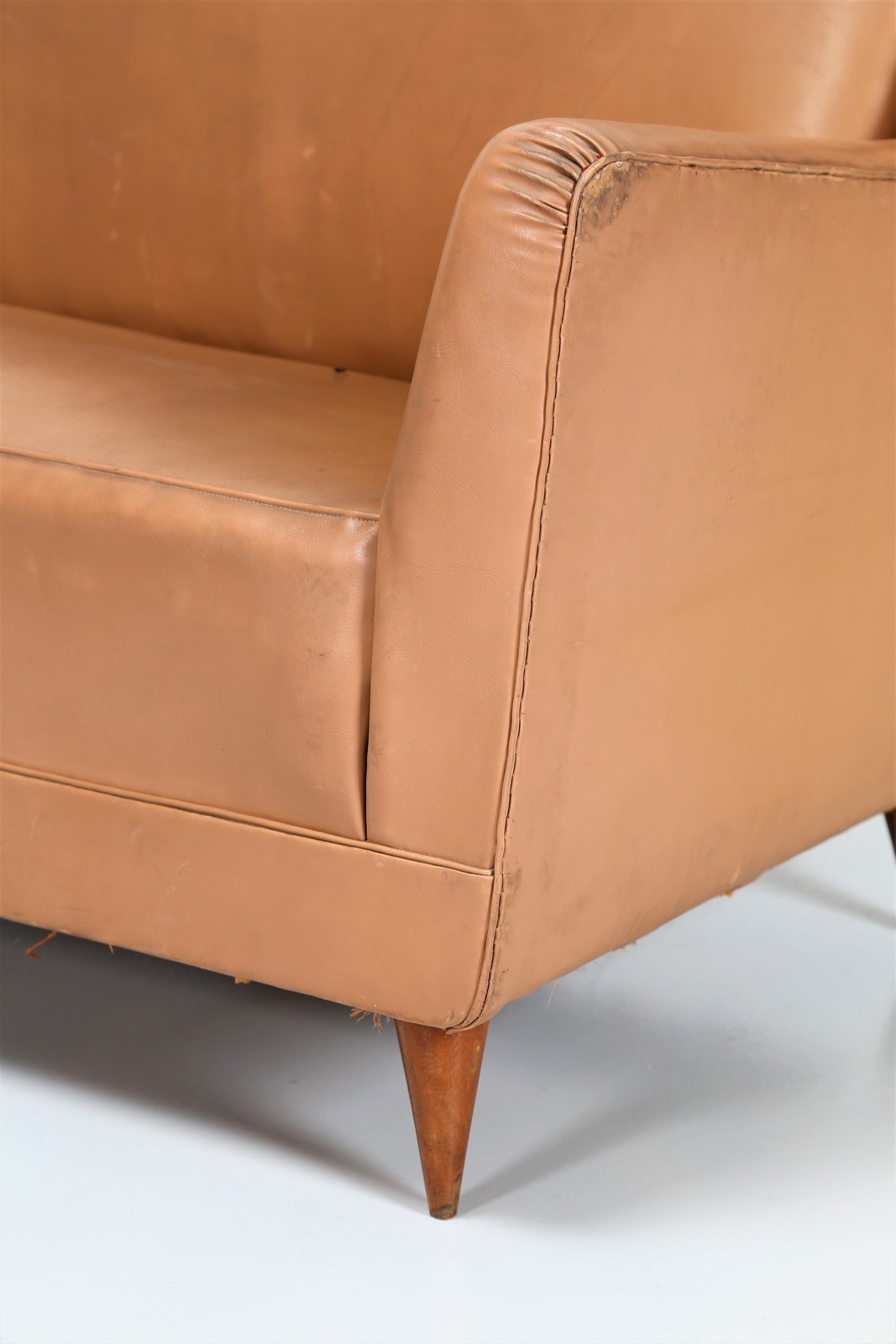 PONTI GIO' (1891 - 1979) Sofa and two stools. . . Wooden structure and imitation leather upholstery. Model created for the furnishings of the Conte Grande ocean liner, launched in 1949. Cassina, Italy, 1940.