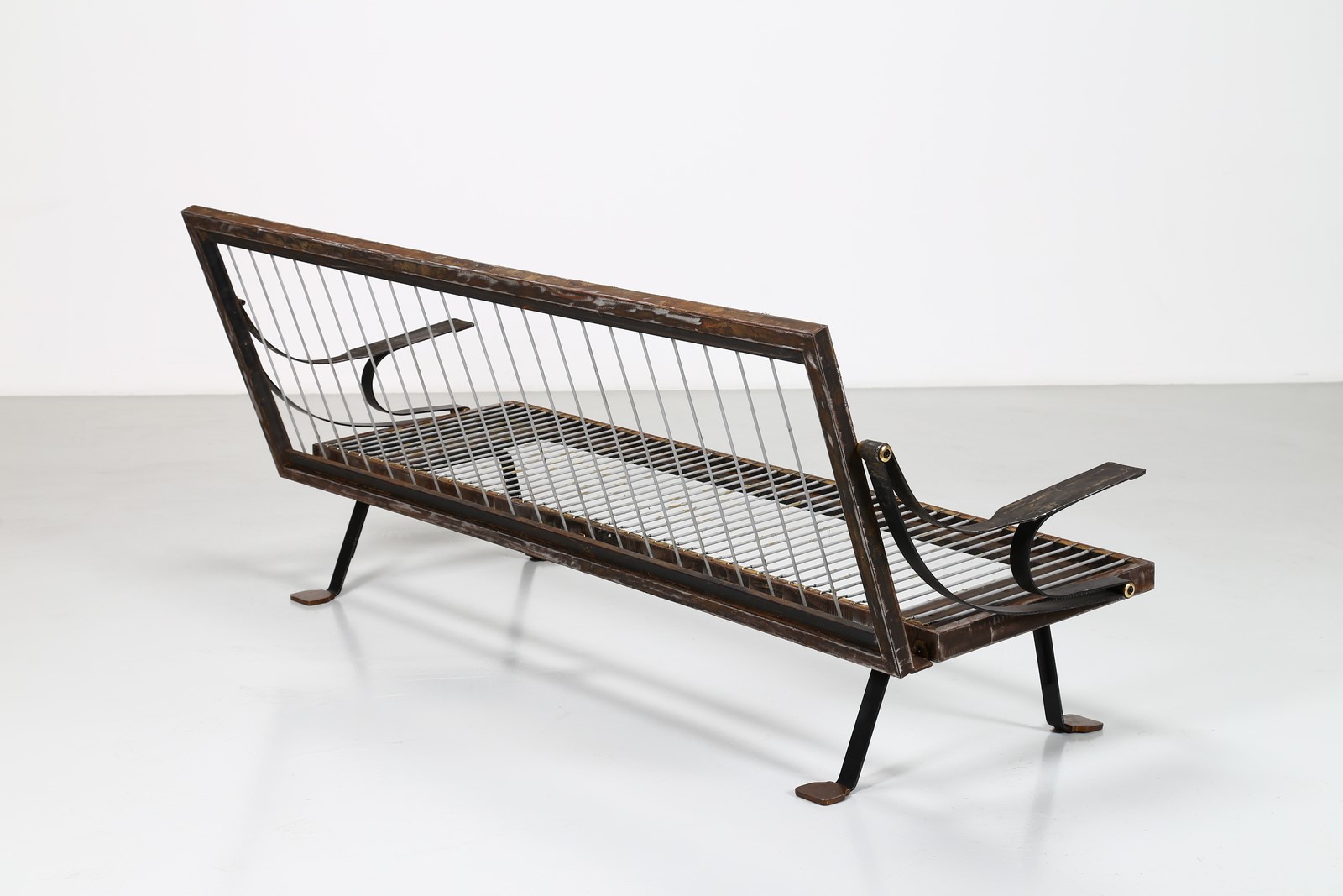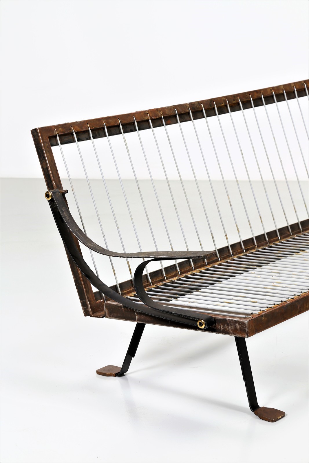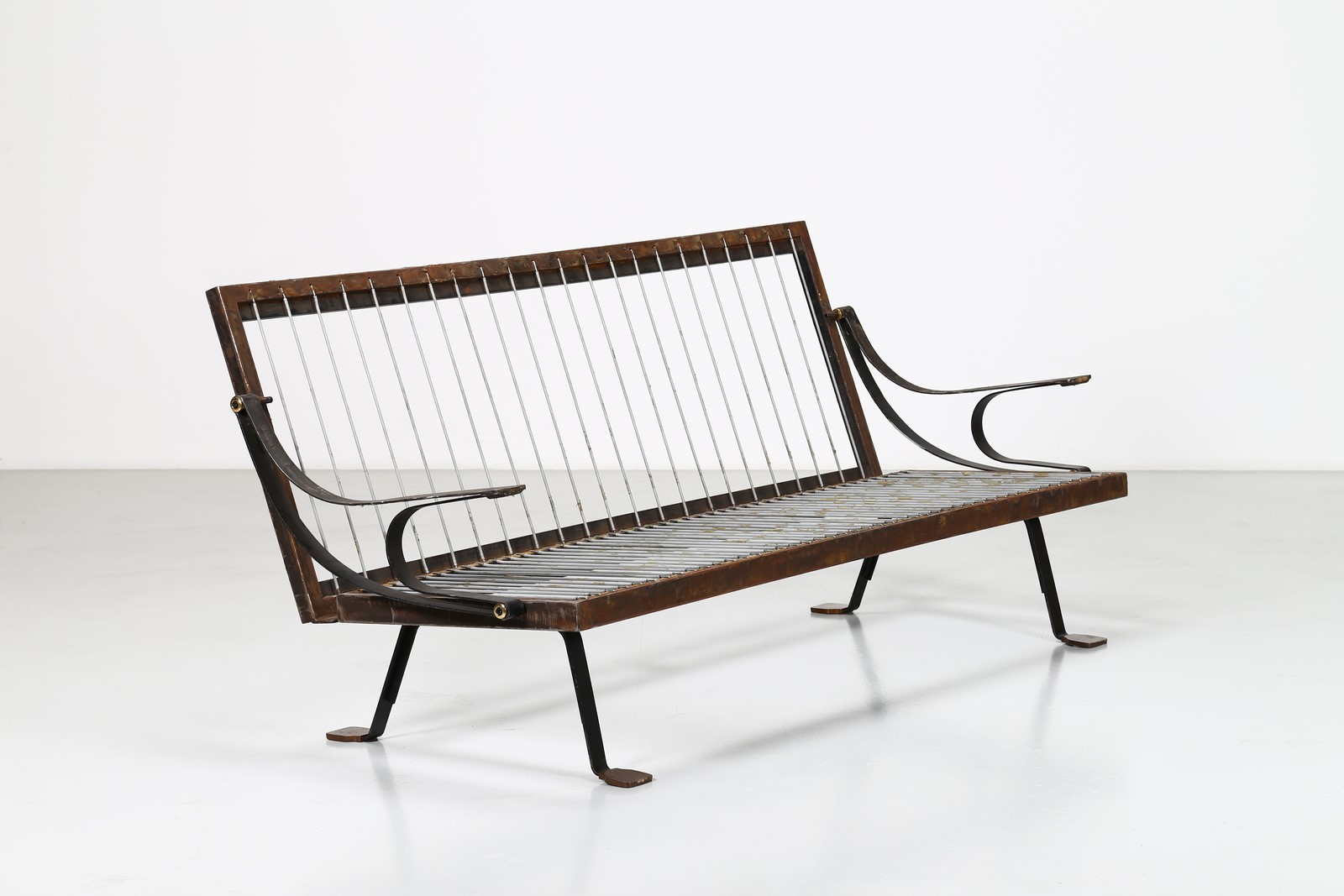 GARDELLA IGNAZIO (1905 - 1999) Digamma sofa. . Cm 197,00 x 82,00 x 83,00. Enamelled metal and brass, elastic tie rods, for Gavina 1957. Publications: Domus num. 330 maggio 1957 pag. 43; Domus num. 391 giugno 1962 pag. 23; I. de Guttry, M. P. Maino, Il mobile italiano degli anni ’40 e ’50, pag. 179, Laterza, 1992; G. Bosoni, F. Picchi, M. Strina, N. Zanardi, Brevetti del Design Italiano 1946-1965, pag. 75, Electa, 2000; G. Gramigna, Repertorio del design italiano per l’arredamento domestico 1950-1980, pag. 108, Allemandi, 1985.