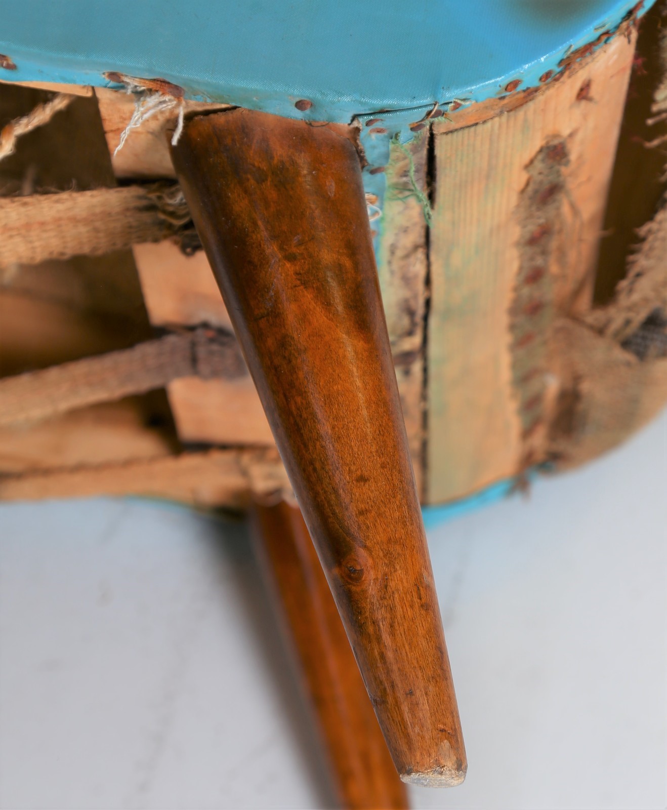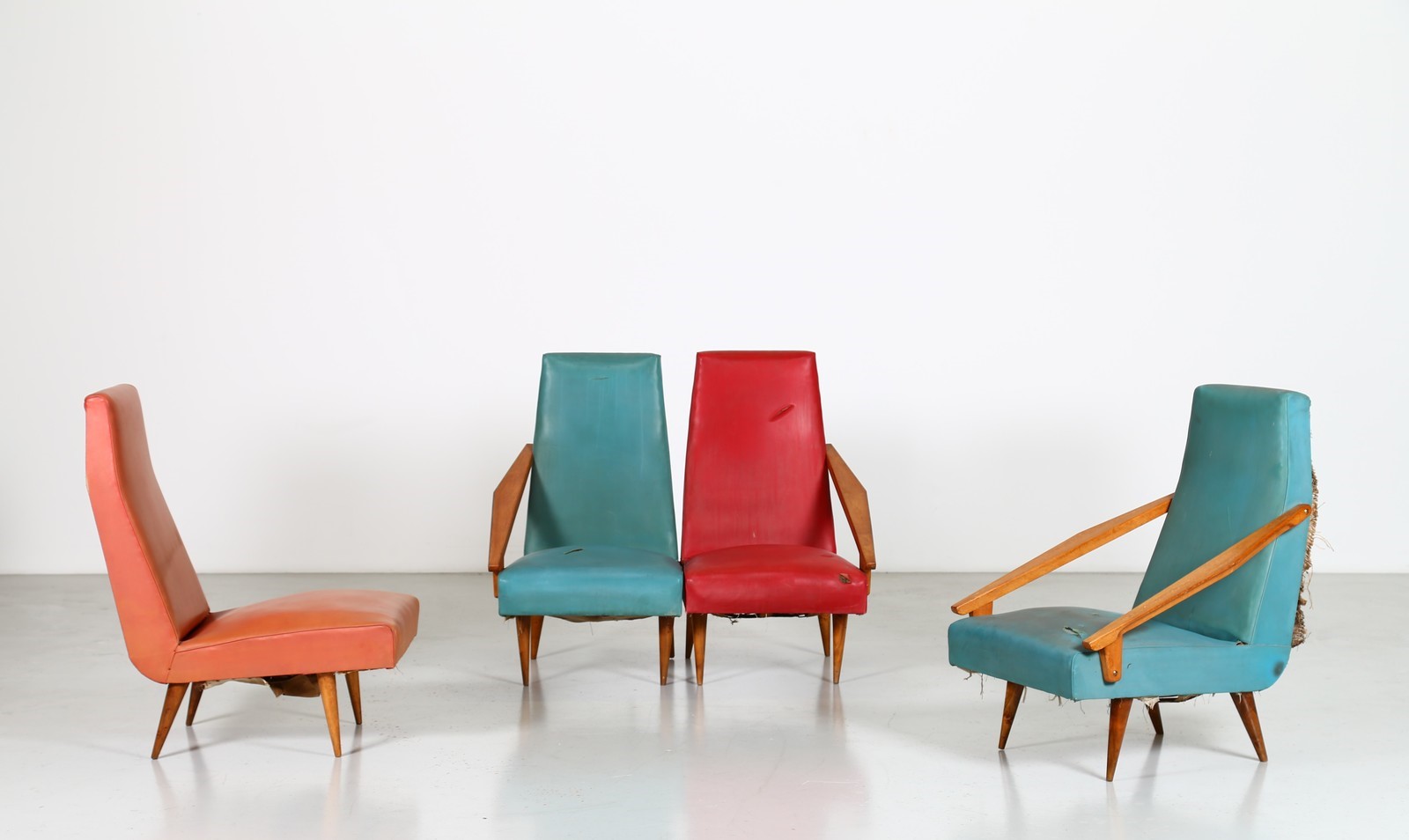 PONTI GIO' (1891 - 1979) Four armchairs. . Cm 60,00 x 92,00 x 85,00. Wooden structure, original imitation leather upholstery, for Altamira furnishings, 1954. Publications: Domus no. 292, March 1954, pg. 62, sofa model.