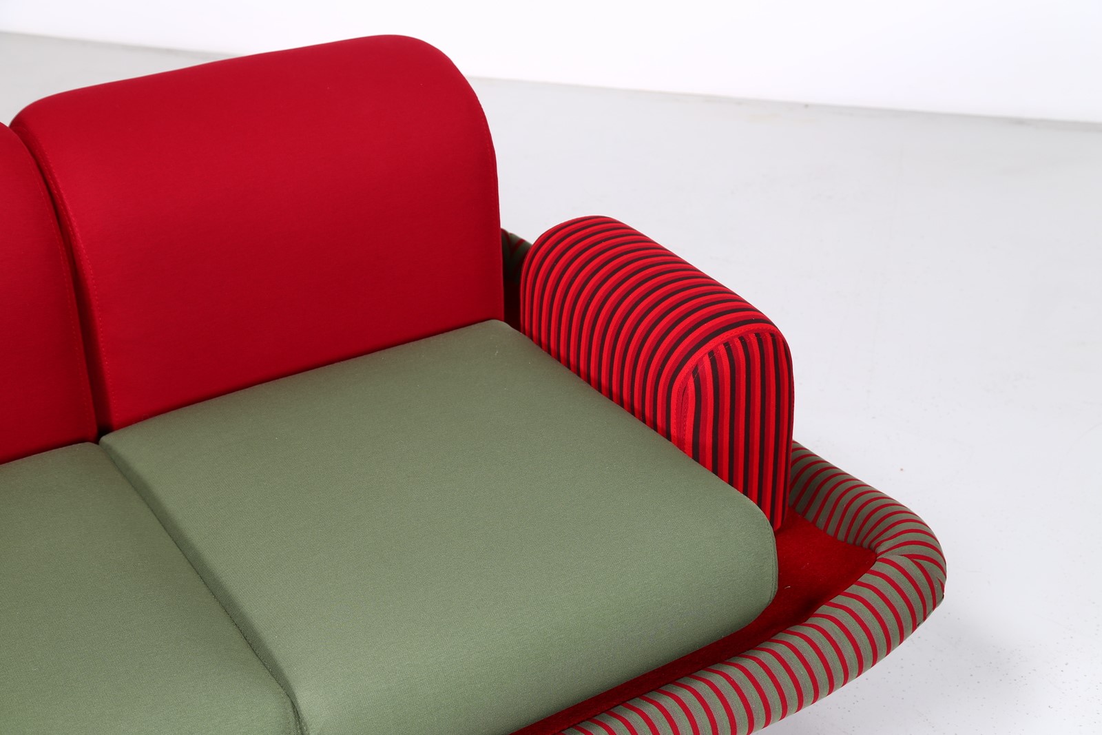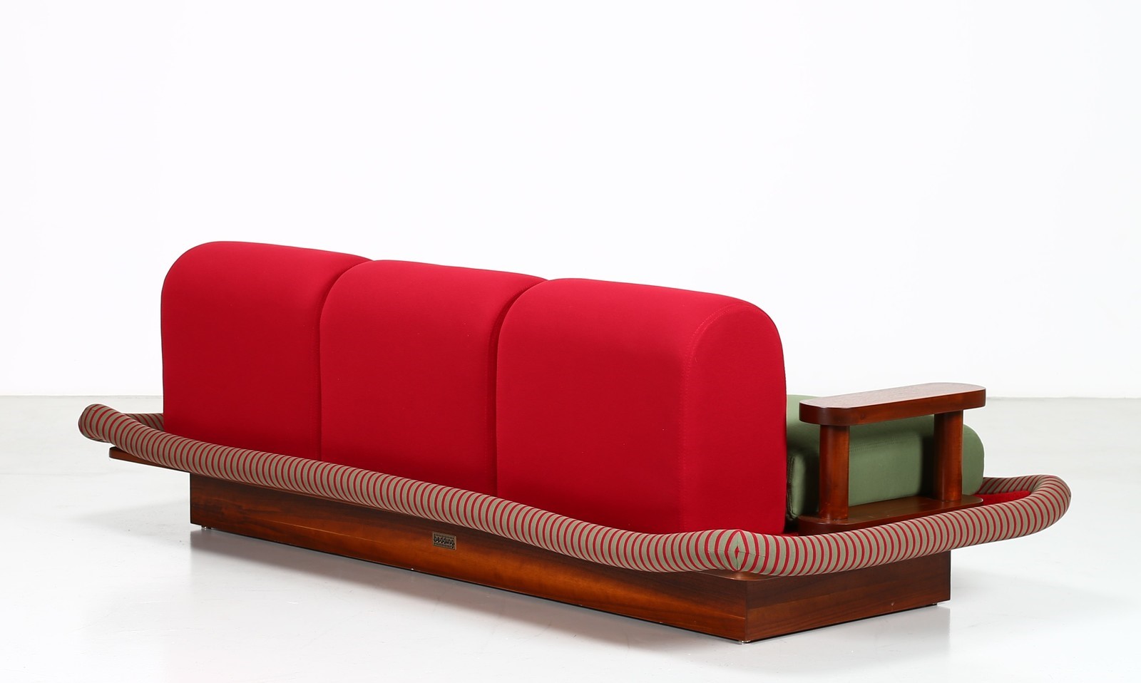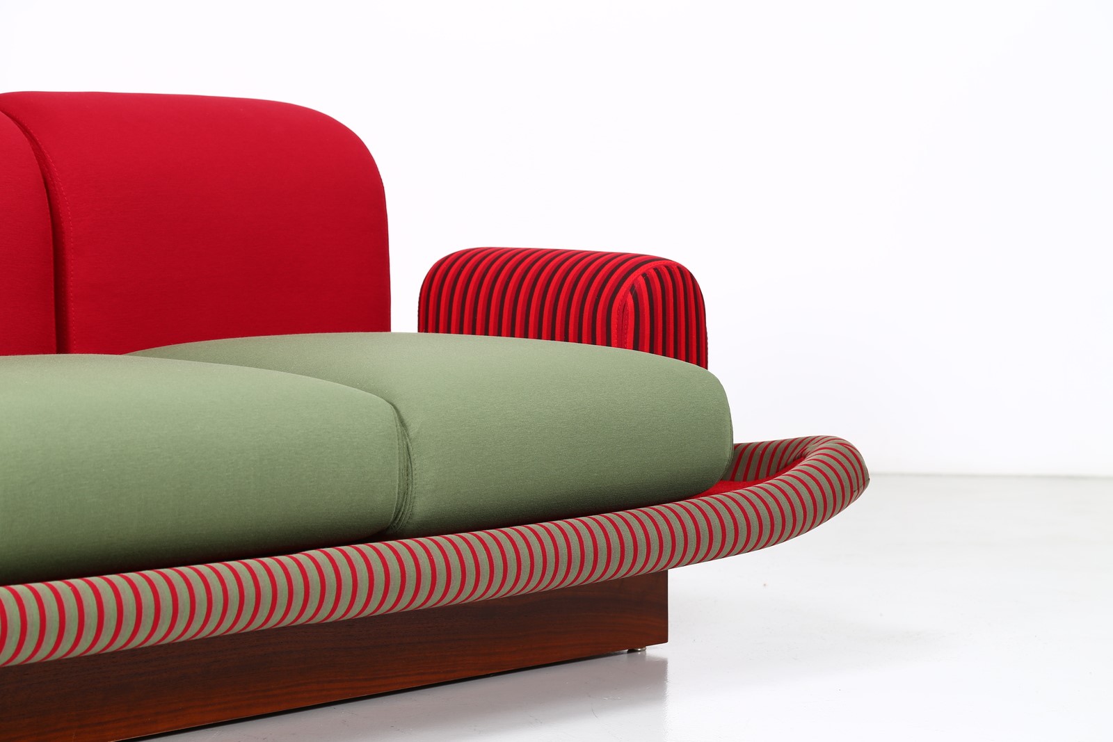 SOTTSASS ETTORE (1917 - 2007) "Tappeto Volante" sofa. . . Wood structure, upholstered in velvet and fabric, for Bedding Brevetti, Casalguidi, 1974.Manufacturer's label present. Private collection, Italy. Publications: Domus, n. 545, aprile 1975, p. 46 for a chair exemple; Andrea Branzi, The Hot House: Italian New Wave Design, Cambridge, 1984, p. 148 for a chair exemple; Barbara Radice, Ettore Sottsass: A Critical Biography, London, 1993, p. 172-73 for a chair exemple.