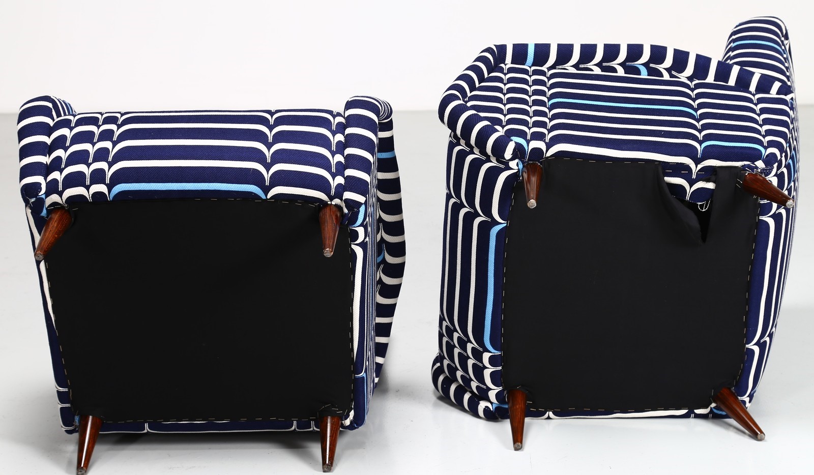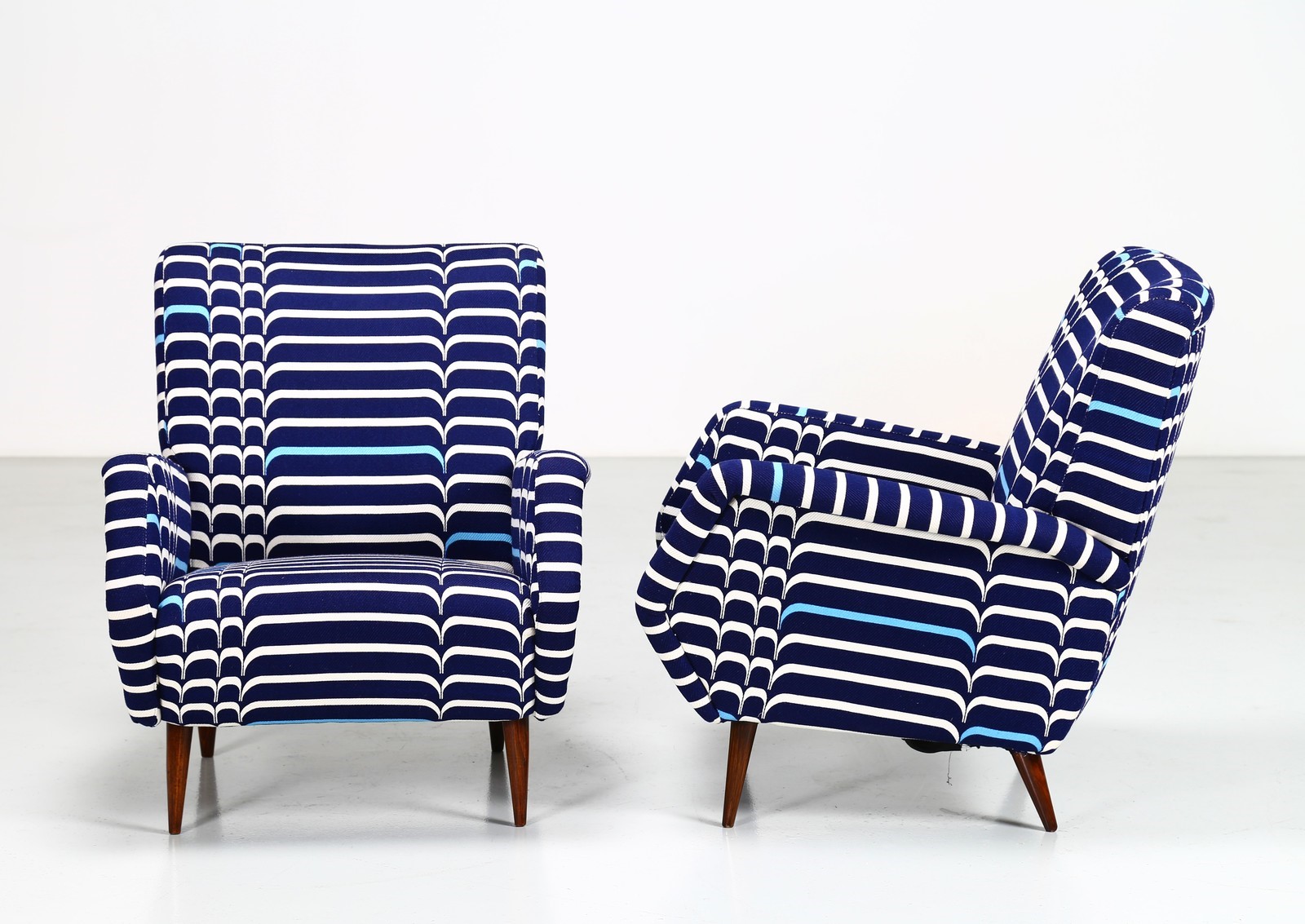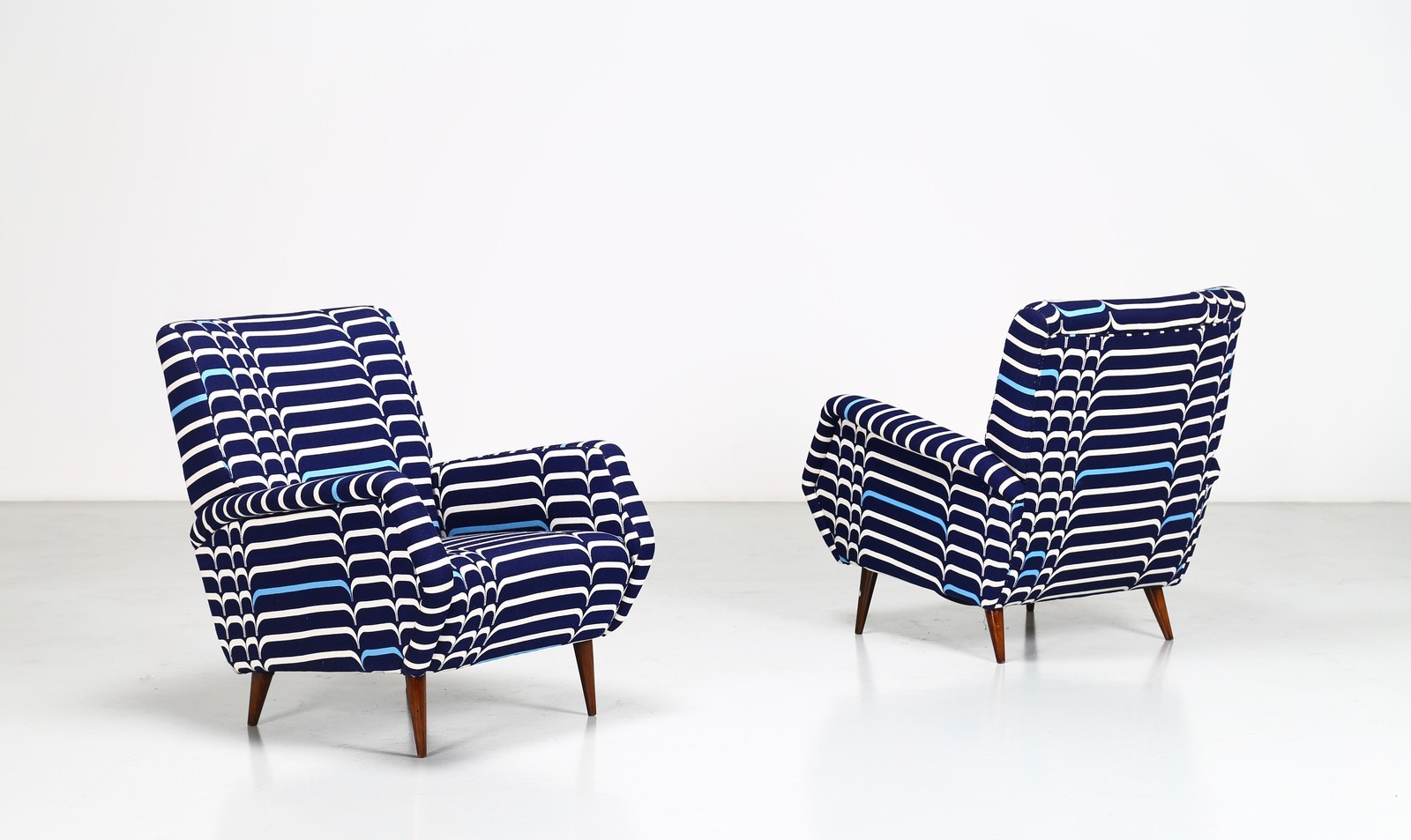 PONTI GIO' (1891 - 1979) Coppia di poltrone. -. Cm 76,00 x 82,00 x 70,00. Struttura in legno, imbottitura in gommapiuma su nastri elastici Pirelli, rivestimento in tessuto "Ponti di Carlo Hauner” mod. 803, per Cassina, 1954 Pubblicazione; Giuliana Gramigna, Repertorio 1950-1980, Mondadori, 1985, pag. 80.Expertise a cura di Salvatore Licitra Archives Gio Ponti Milano.
