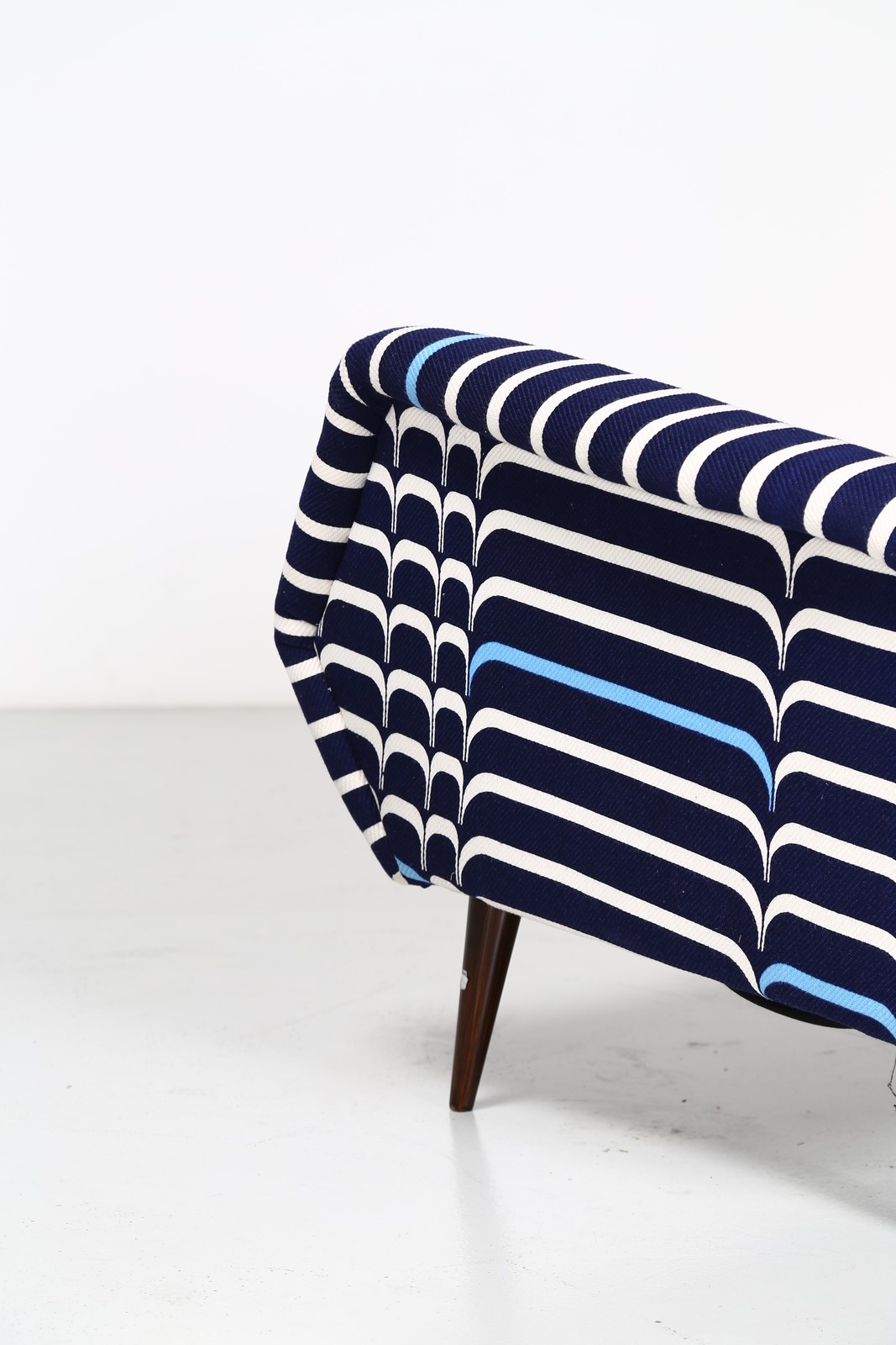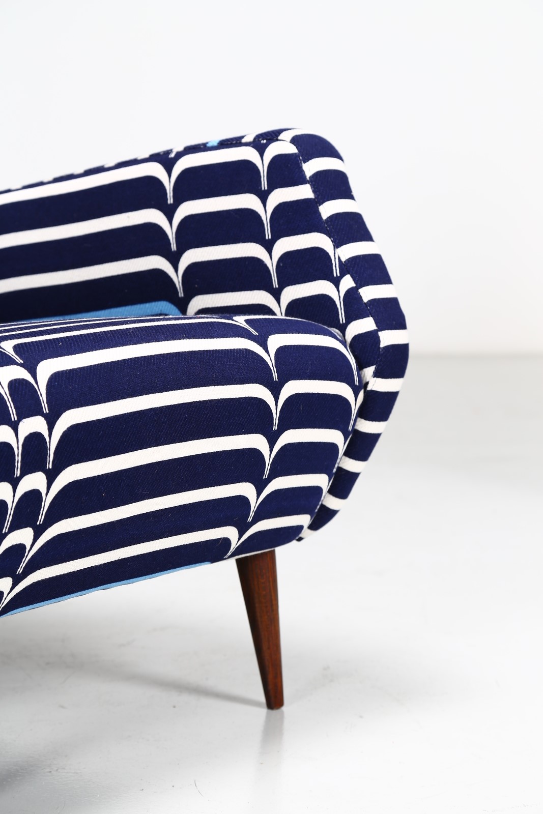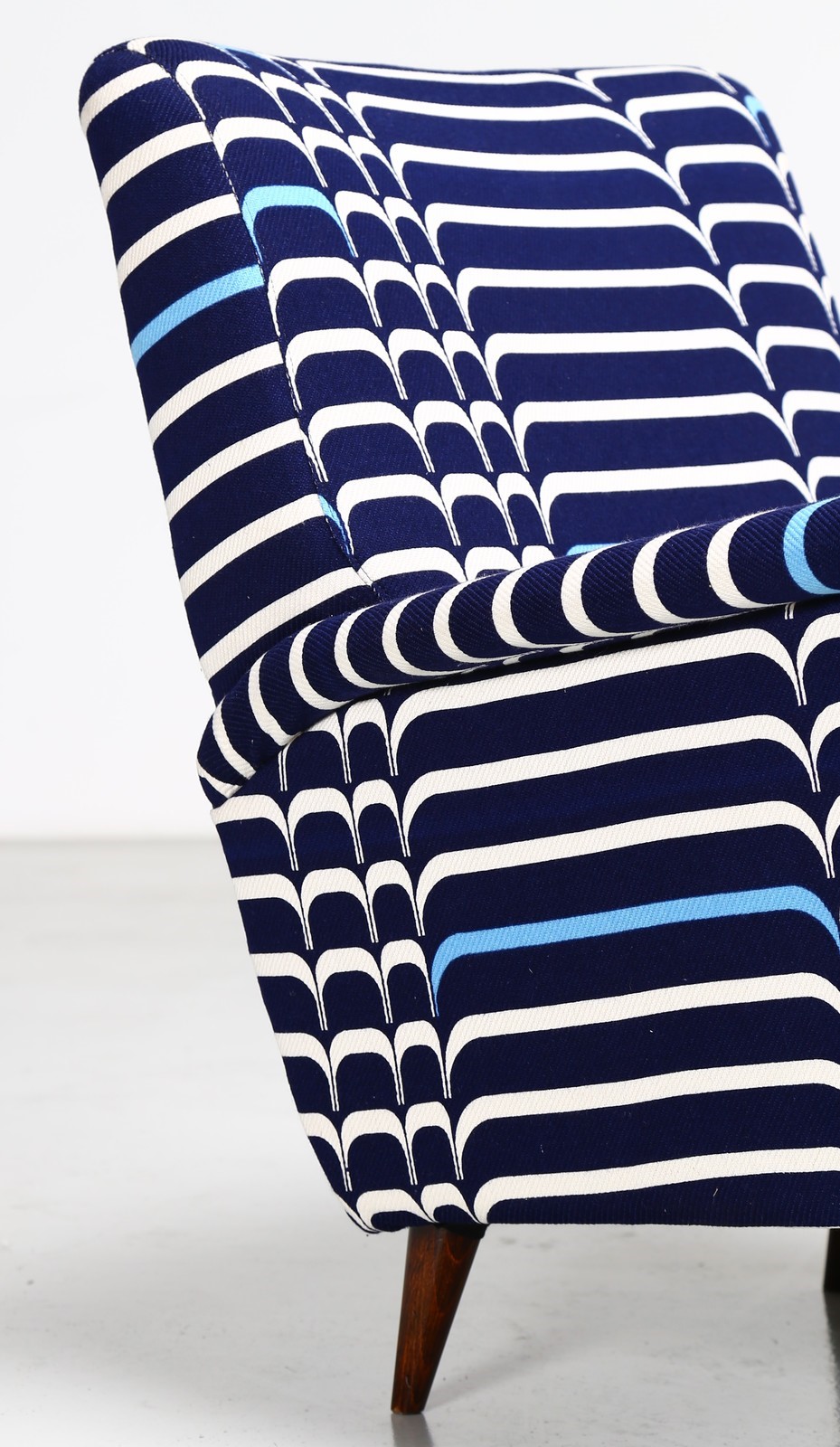 PONTI GIO' (1891 - 1979) Coppia di poltrone. -. Cm 76,00 x 82,00 x 70,00. Struttura in legno, imbottitura in gommapiuma su nastri elastici Pirelli, rivestimento in tessuto "Ponti di Carlo Hauner” mod. 803, per Cassina, 1954 Pubblicazione; Giuliana Gramigna, Repertorio 1950-1980, Mondadori, 1985, pag. 80.Expertise a cura di Salvatore Licitra Archives Gio Ponti Milano.