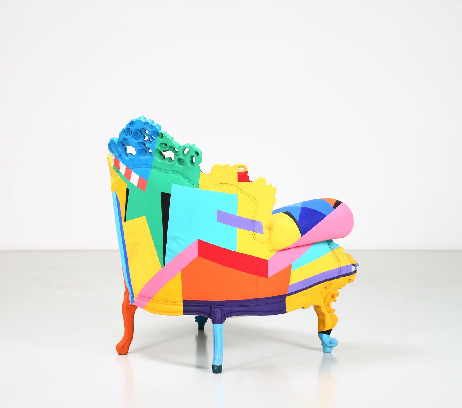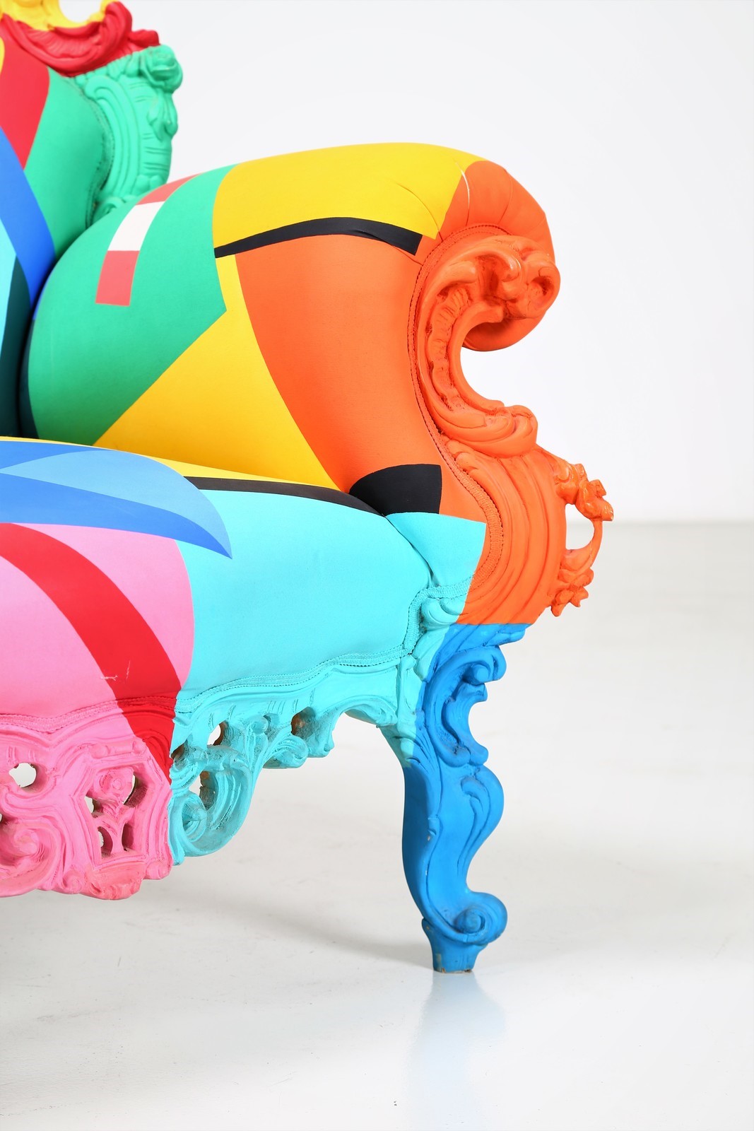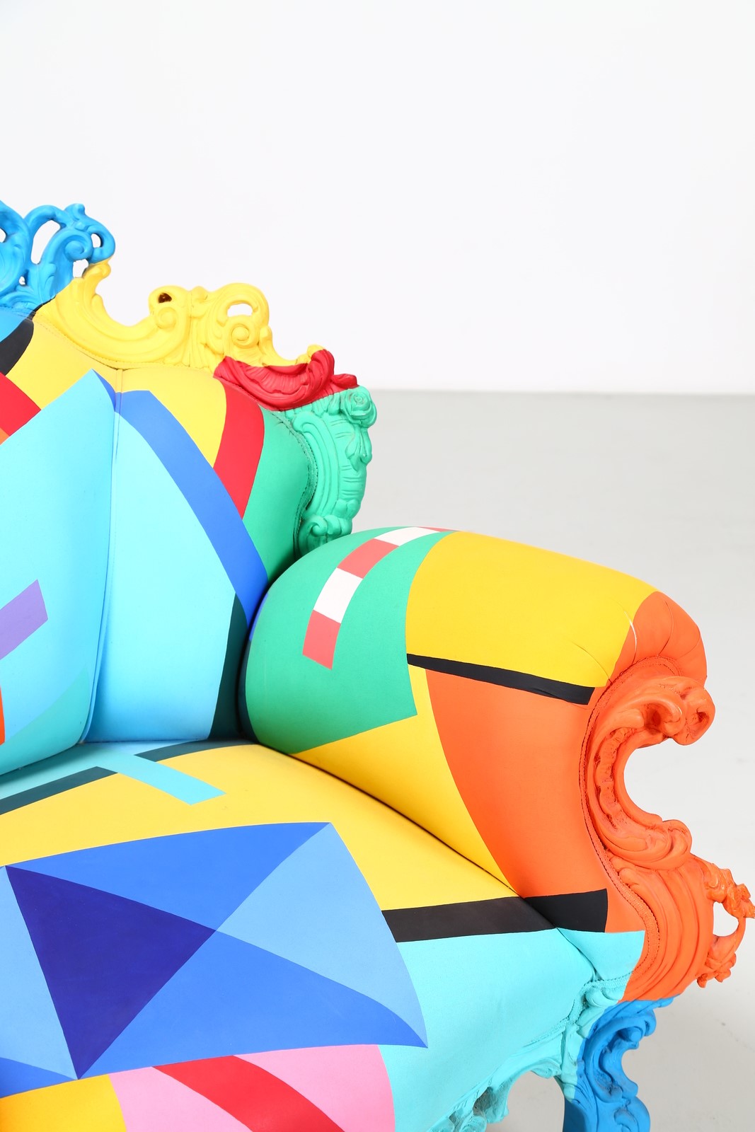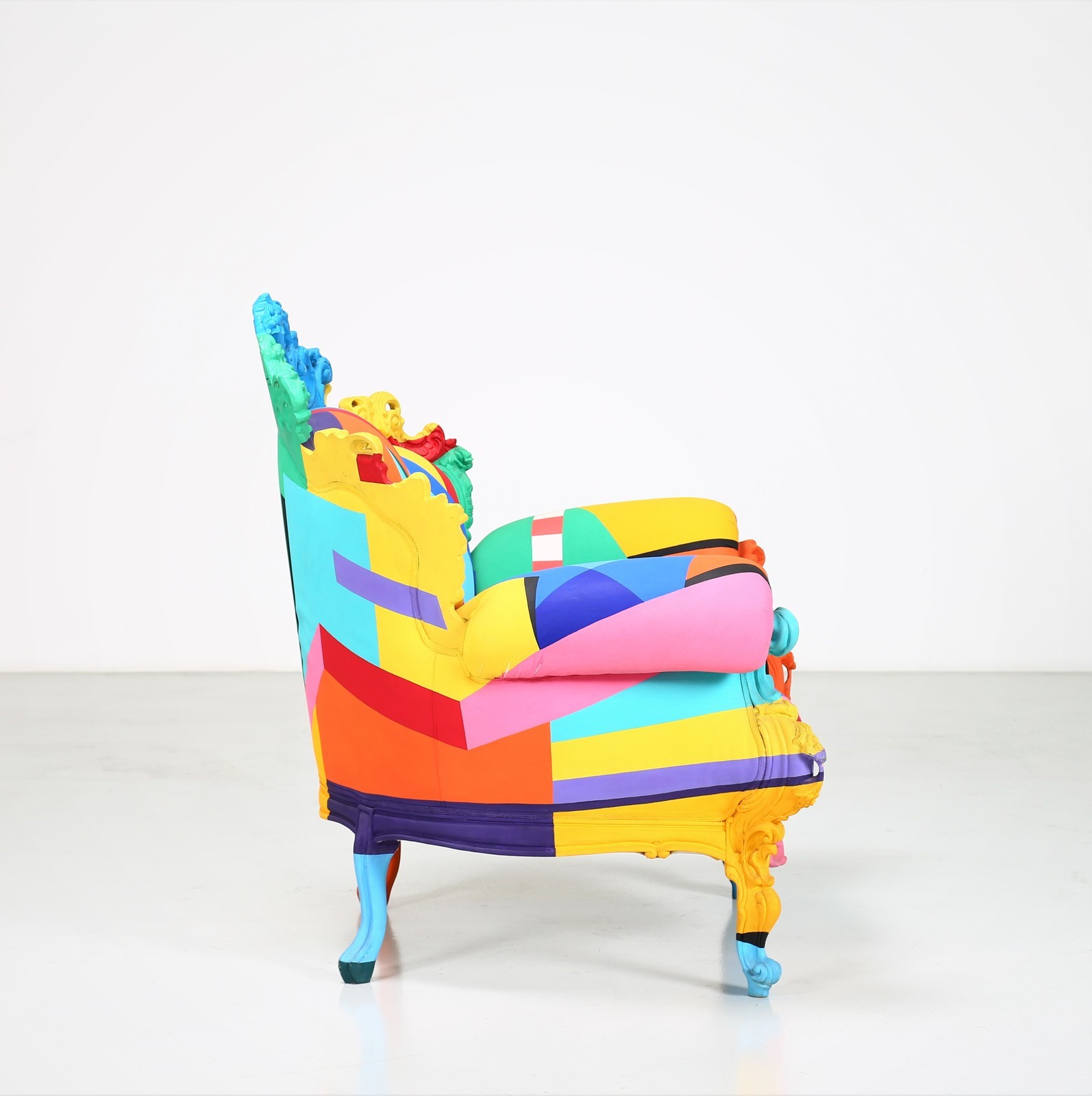MENDINI ALESSANDRO (n. 1931) Geometric armchair, 2001. . Cm 104,00 x 106,00 x 90,00. Produced for the SAIE Bologna installation "Il bagno assente", only copy, fabric with hand-painted wooden shell. Includes certificate of authenticity signed by the maker.