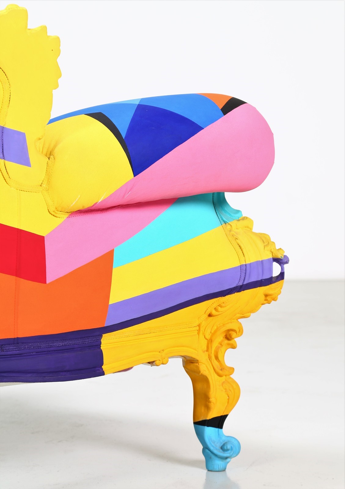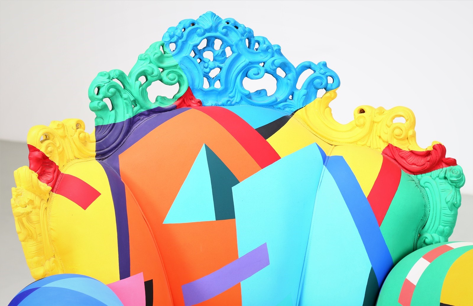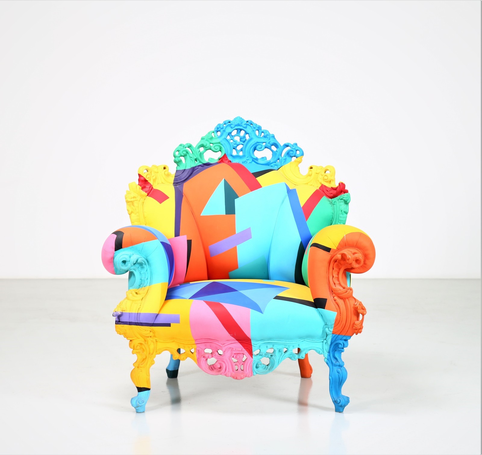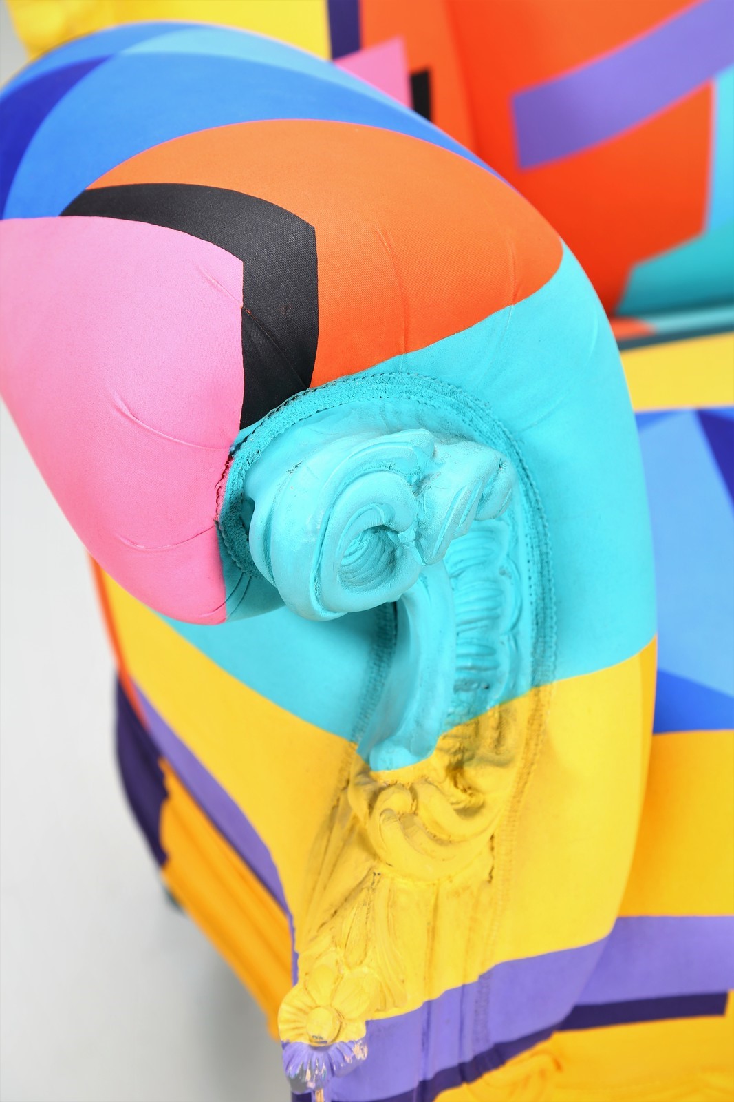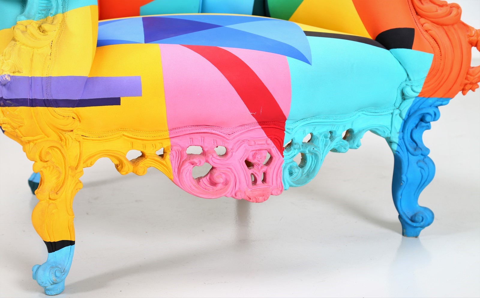 MENDINI ALESSANDRO (n. 1931) Geometric armchair, 2001. . Cm 104,00 x 106,00 x 90,00. Produced for the SAIE Bologna installation "Il bagno assente", only copy, fabric with hand-painted wooden shell. Includes certificate of authenticity signed by the maker.