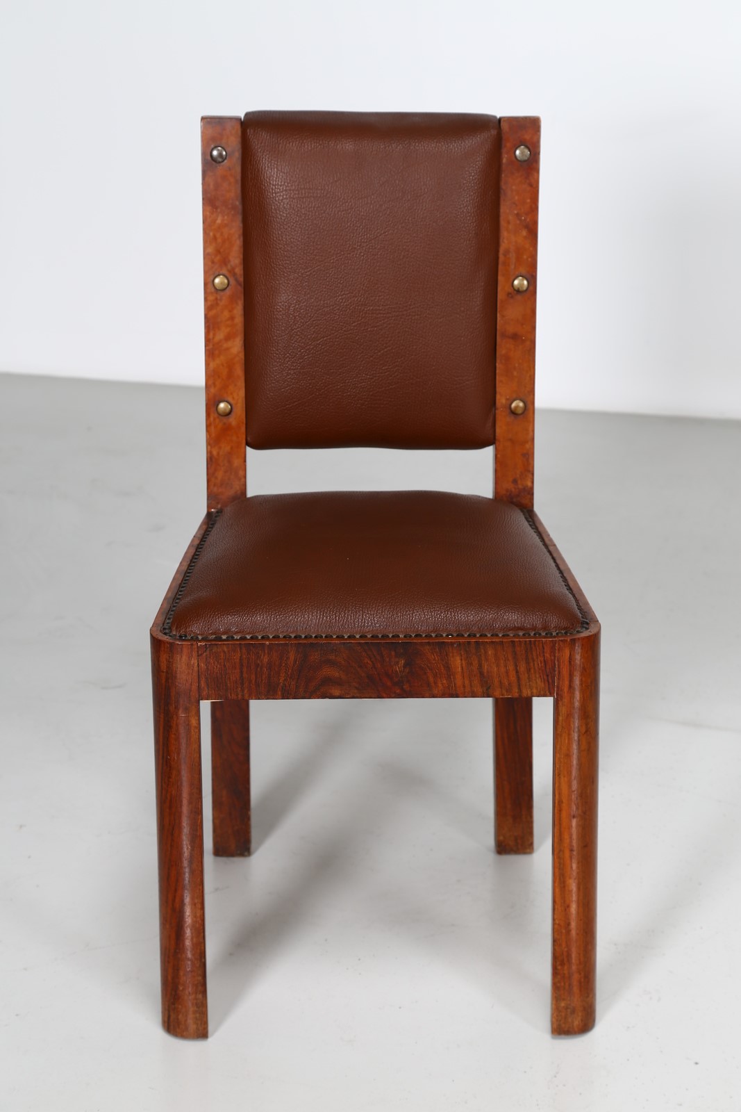 BORSANI OSVALDO (1911 - 1985) Six chairs. . Cm 46,00 x 90,00 x 55,00. Rosewood, boxwood and imitation leather, presented at the V Triennale – La Casa Minima, 1933, private collection, Milan. Publications: La Rivista illustrata del popolo d'Italia - numero speciale V Triennale di Milano 1933 pg. 141; V Triennale di Milano - Catalogo ufficiale 1933 pg. 617-618.