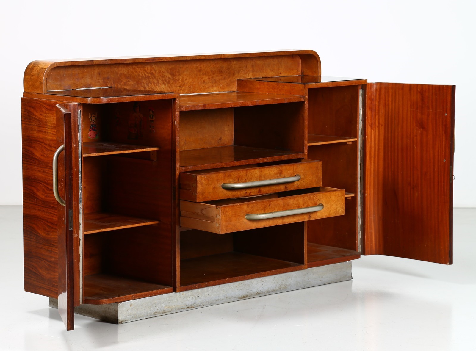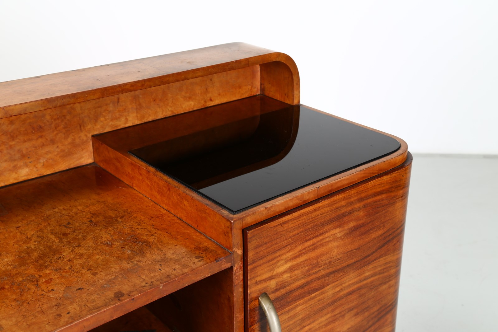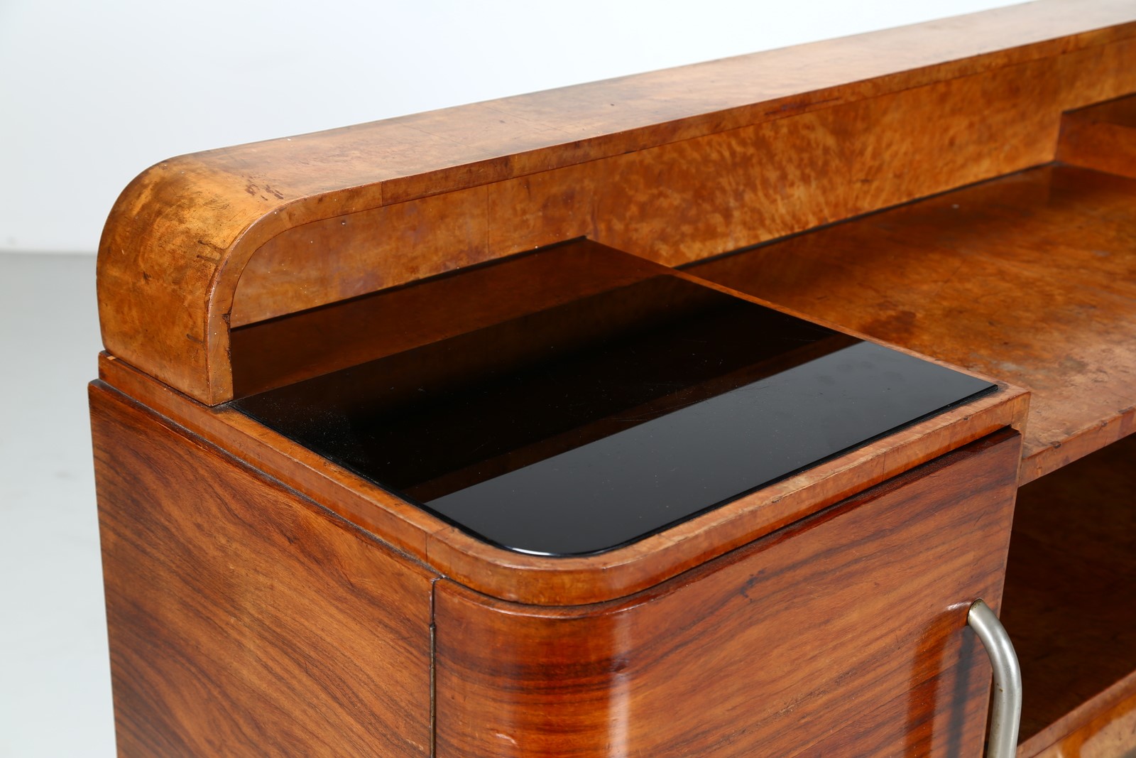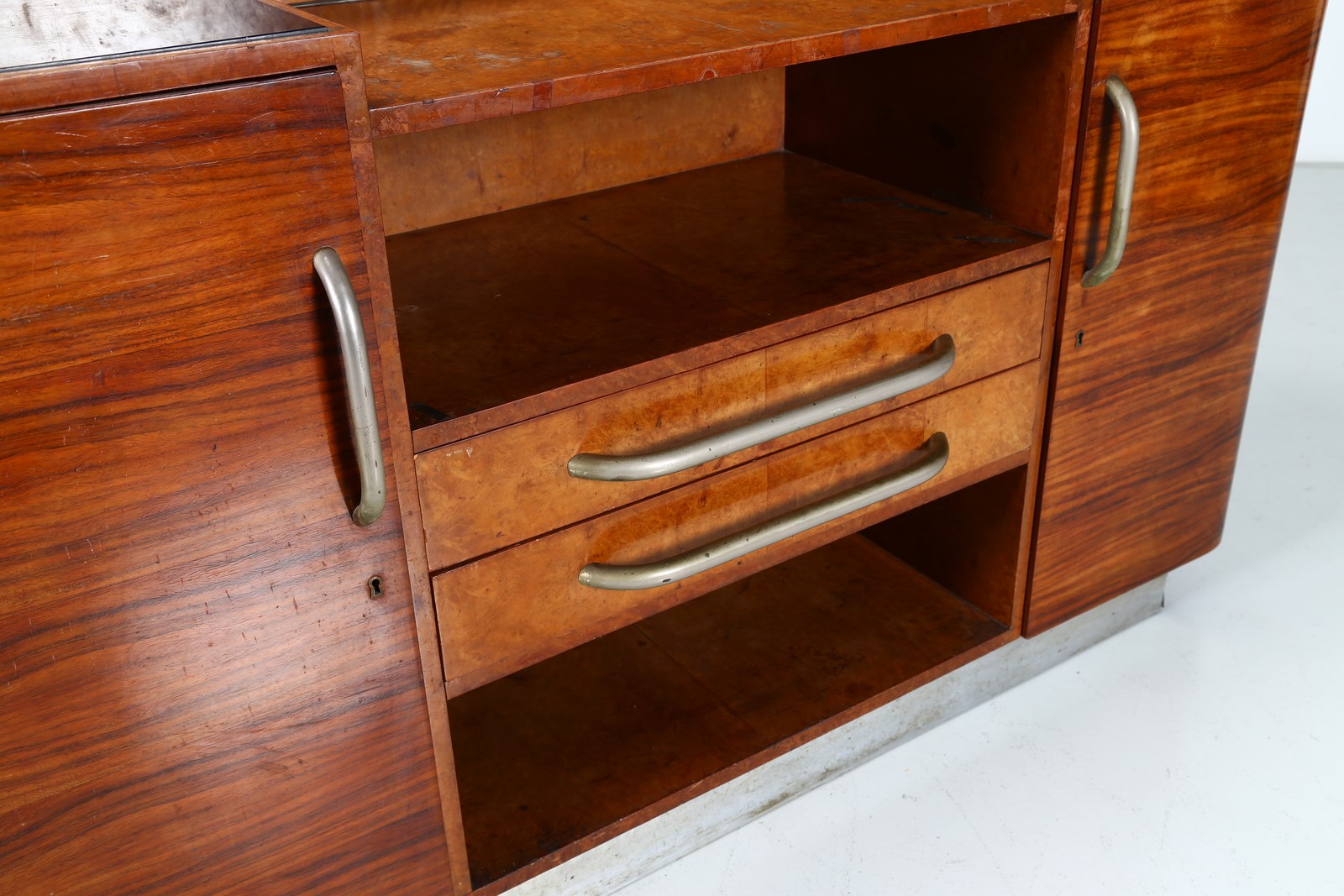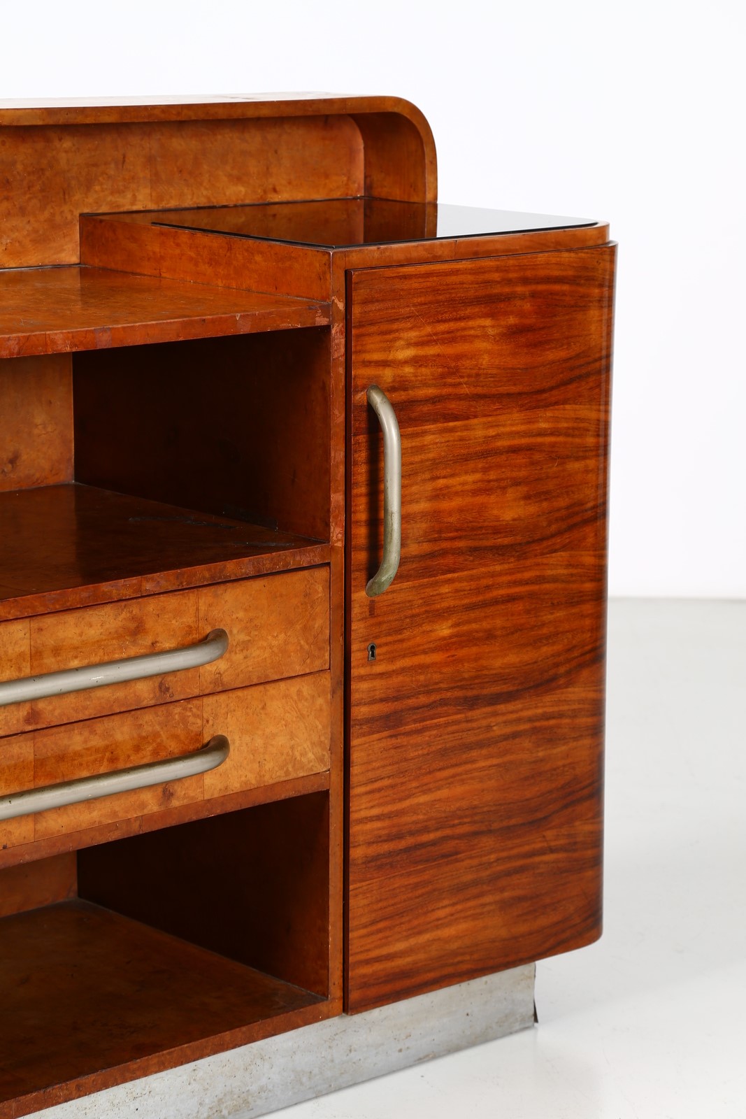 BORSANI OSVALDO (1911 - 1985) Credenza. -. Cm 180,00 x 114,00 x 53,00. Legno di palissandro e radica, piani in cristallo presentata alla V Triennale La Casa Minima, 1933, collezione privata, Milano. Pubblicazioni; La Rivista illustrata del popolo d'Italia - numero speciale V Triennale di Milano 1933 p. 141; V Triennale di Milano - Catalogo ufficiale 1933 pag. 617-618.