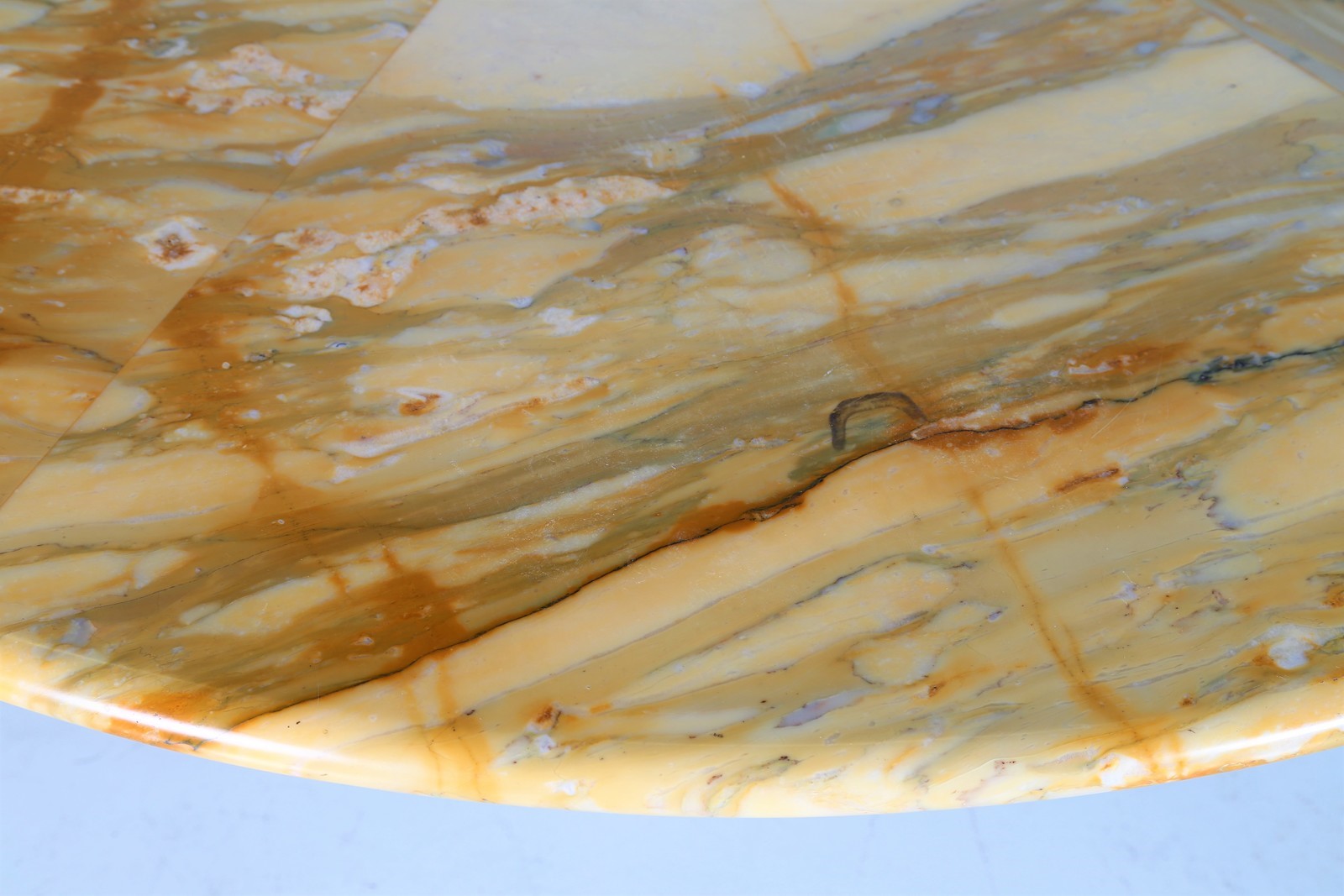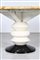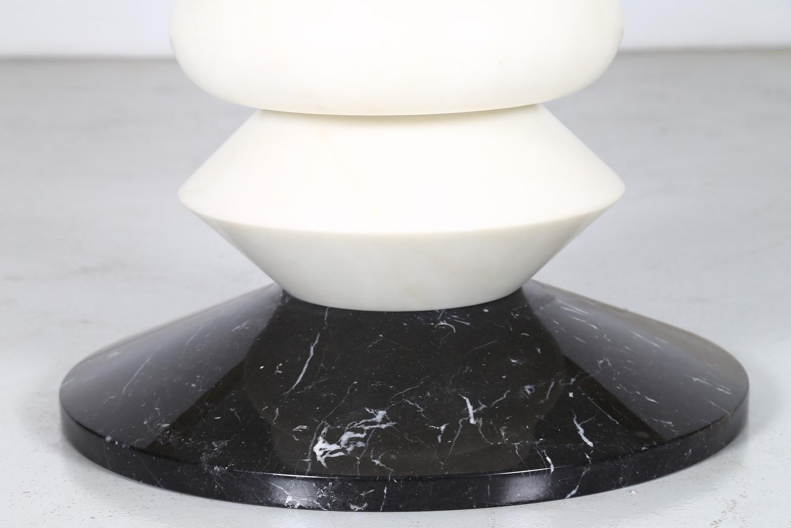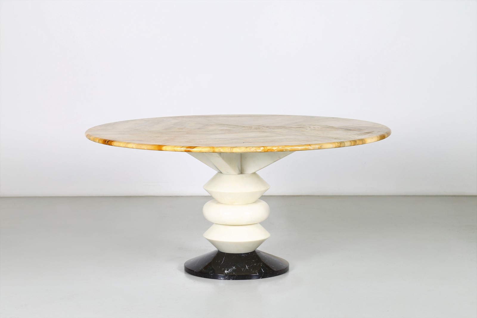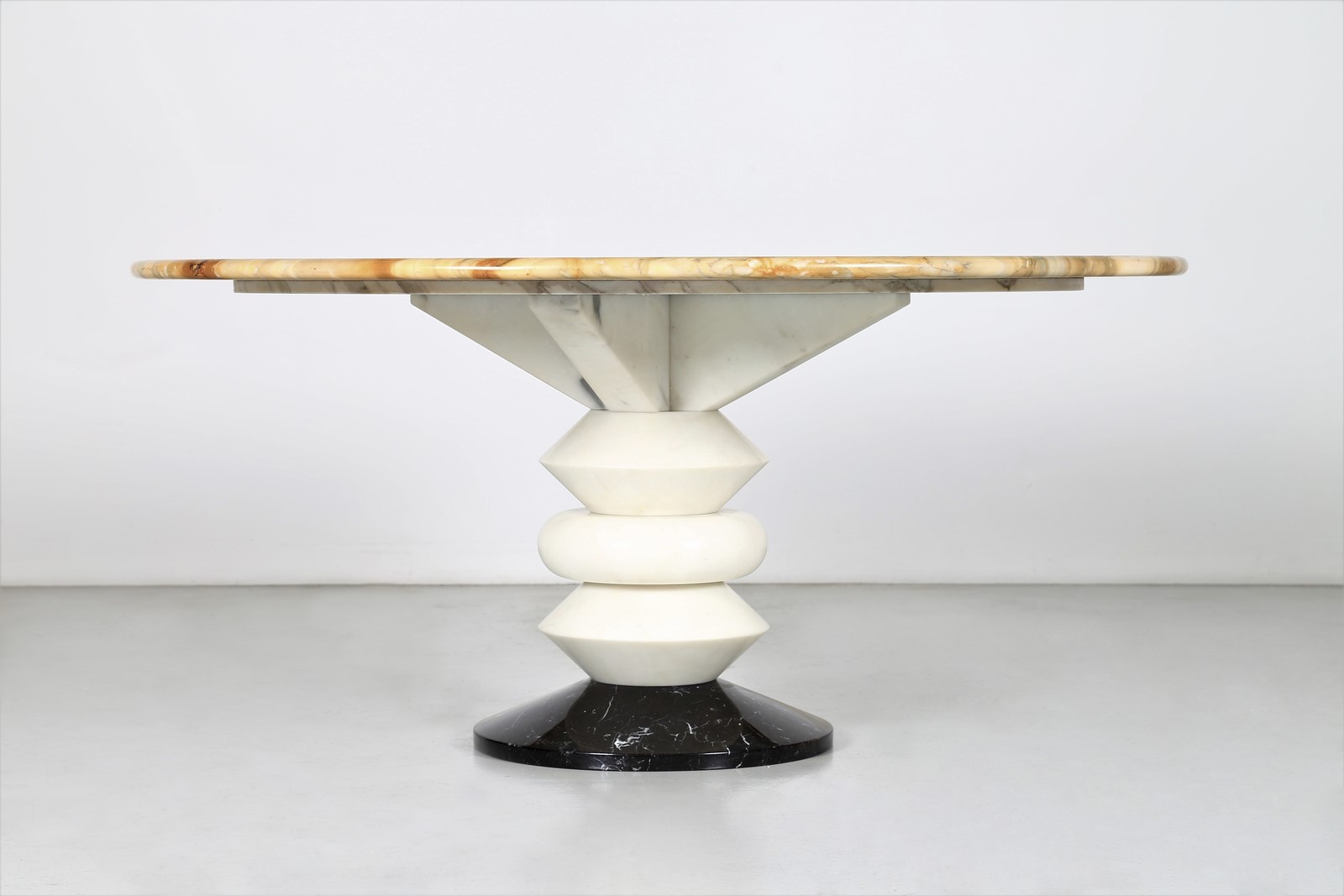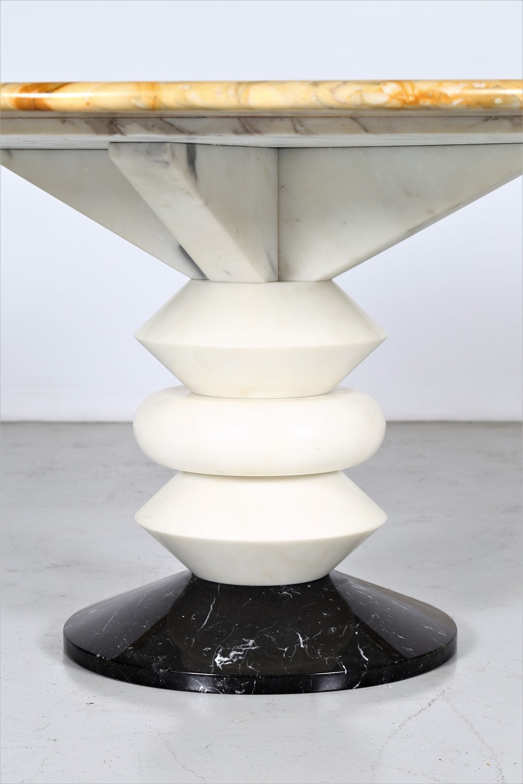 SOTTSASS ETTORE (1917 - 2007) Table (unique piece). 1989. . Cm 160,00 x 75,50. Top in segmented yellow Siena marble, undertop in white Carrara marble, column in pure white marble and base in black marble. Single copy produced by the architect Egidio Di Rosa for Ultima Edizione, commissioned by Professor Gelli for an important residence. Accompanied by a declaration by the architect Egidio Di Rosa, "Ultima Edizione". Dated and signed, 1989.