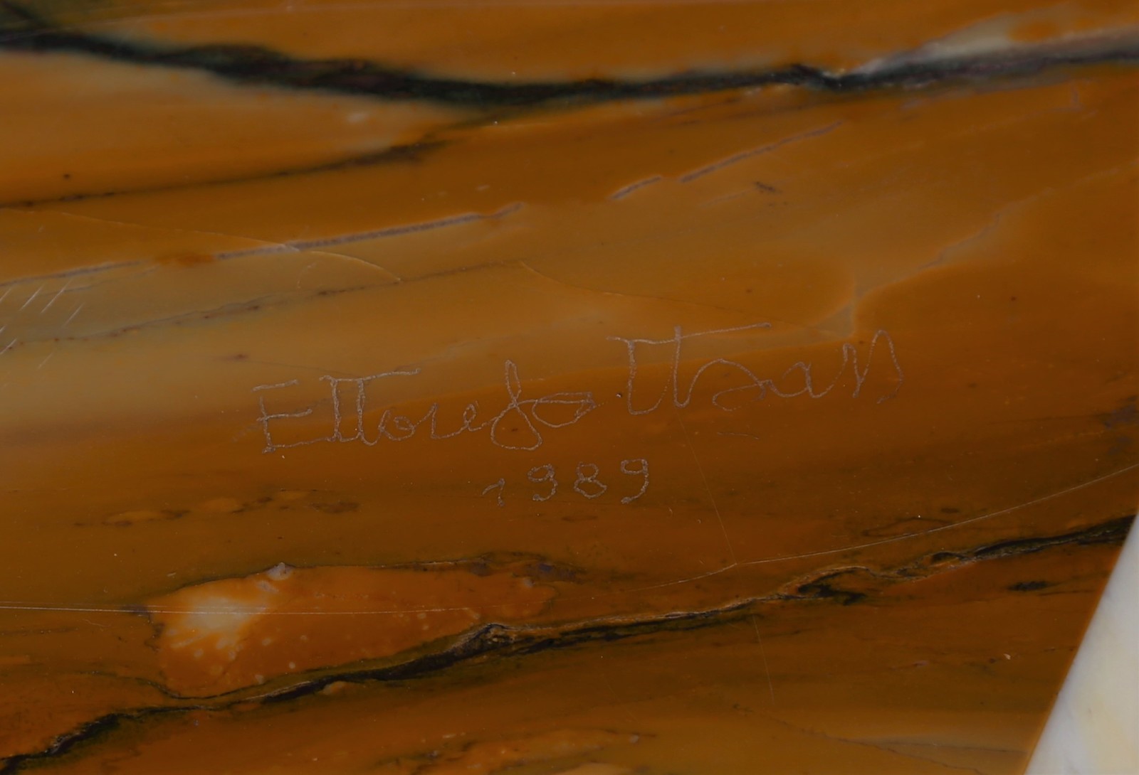 SOTTSASS ETTORE (1917 - 2007) Tavolo pezzo unico. 1989. -. Cm 160,00 x 75,50. Piano in marmo giallo di Siena a spicchi, contro piano in marmo bianco di Carrara, colonna in marmo bianco assoluto e basamento in marmo nero. Realizzato in un unico esemplare dall’architetto Egidio Di Rosa per Ultima Edizione su commissione del professor Gelli per importante dimora. Accompagnato da dichiarazione dell’architetto Egidio Di Rosa “Ultima Edizione”. Data e firma presente, 1989.