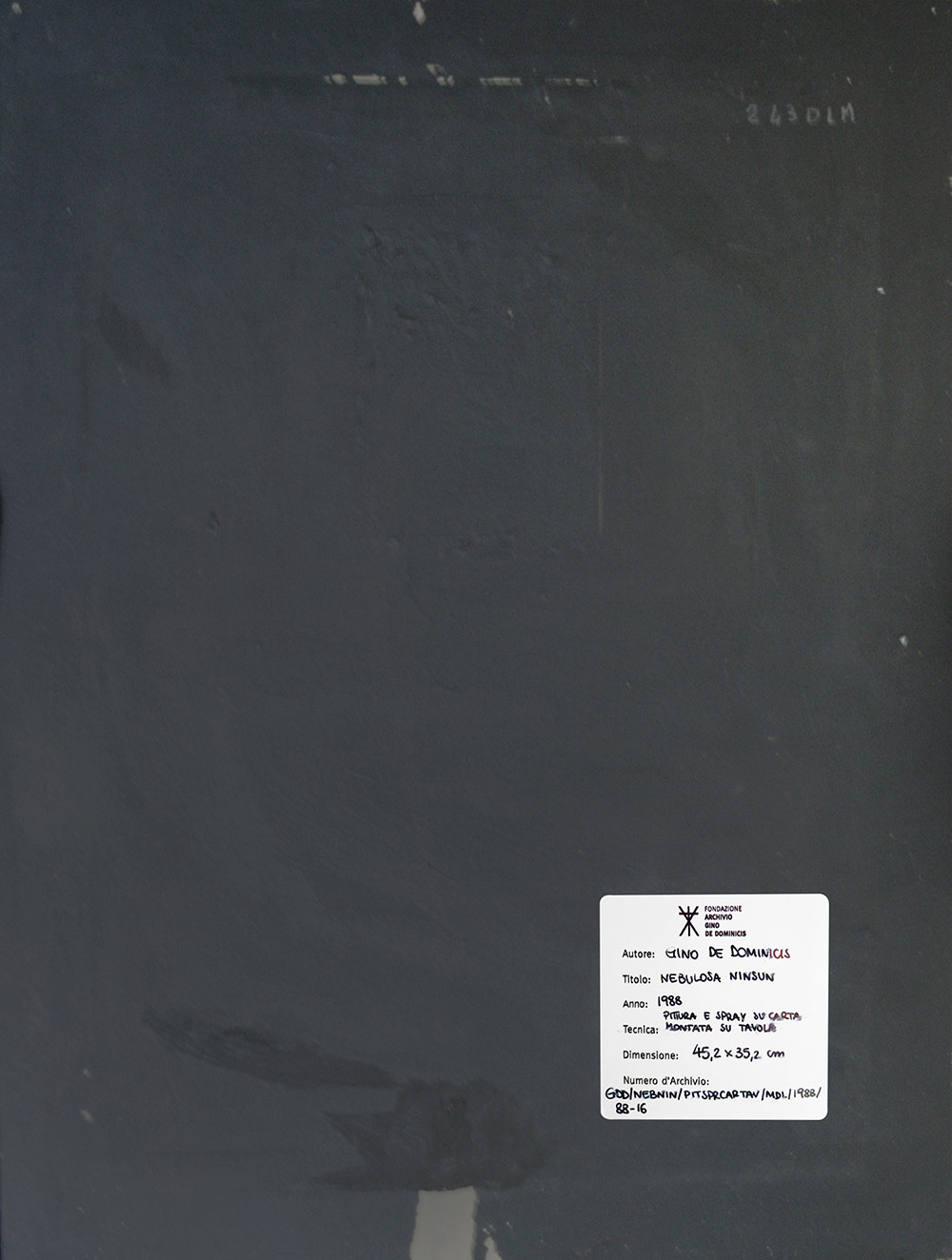 Gino De Dominicis, Nebulosa Ninsun, 1988 Pittura e spray su carta montata su tavola 45x2x35,2 cm Firma in basso a destra Certificato di autenticità su foto rilasciato dalla FONDAZIONE ARCHIVIO GINO DE DOMINICIS, a firma del Presidente Vittorio Sgarbi e del Vicepresidente Marta Massaioli N. archivio GDD/NebNin/PitSprCarTav/MDL/1988/88-16 Provenienza Massimo De Luca Opera pubblicata nel Catalogo Ragionato generale dell'artista